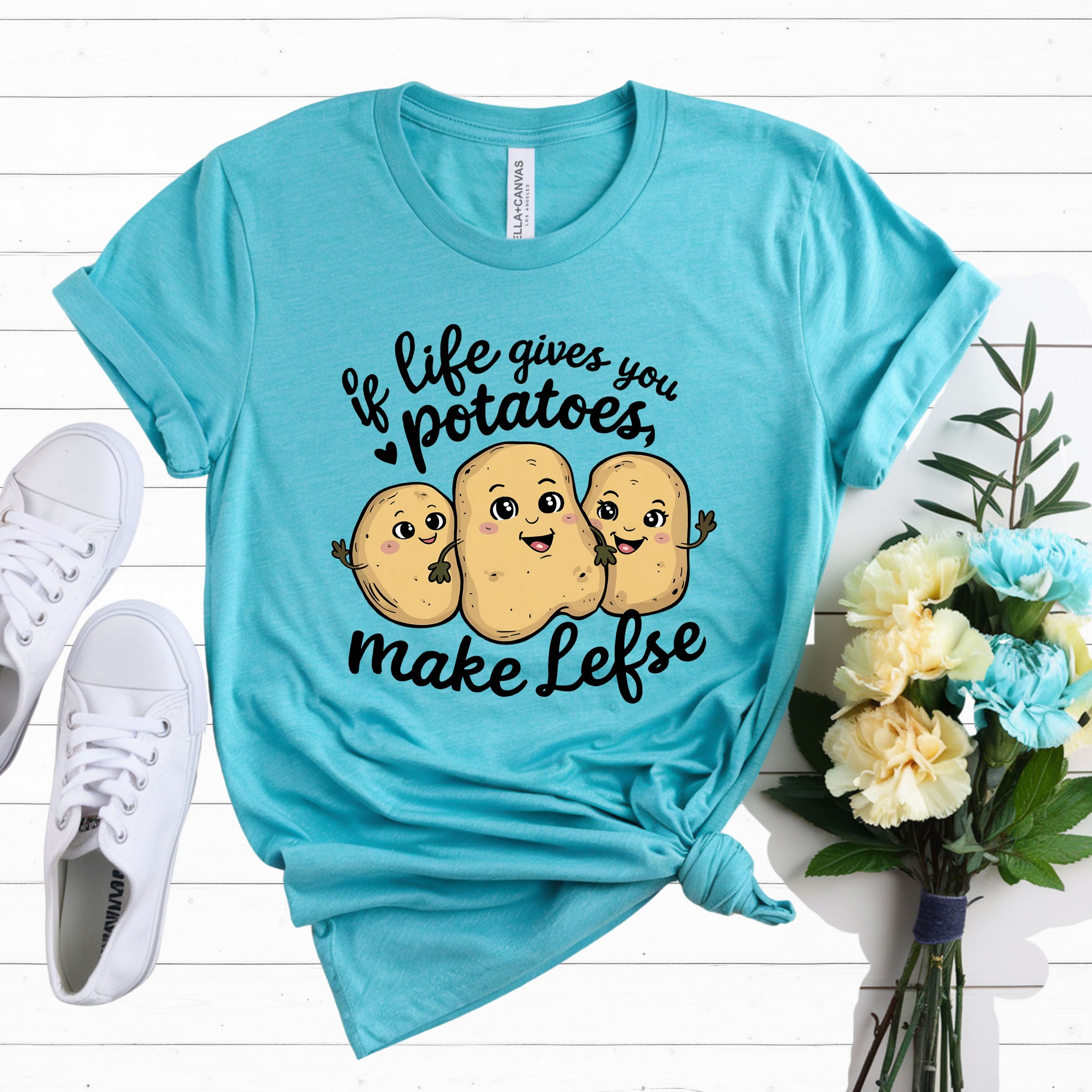 When life gives you potatoes… you definitely make lefse This fun and cozy t-shirt features three adorable kawaii potatoes paired with the playful phrase “If life gives you potatoes, make lefse.”