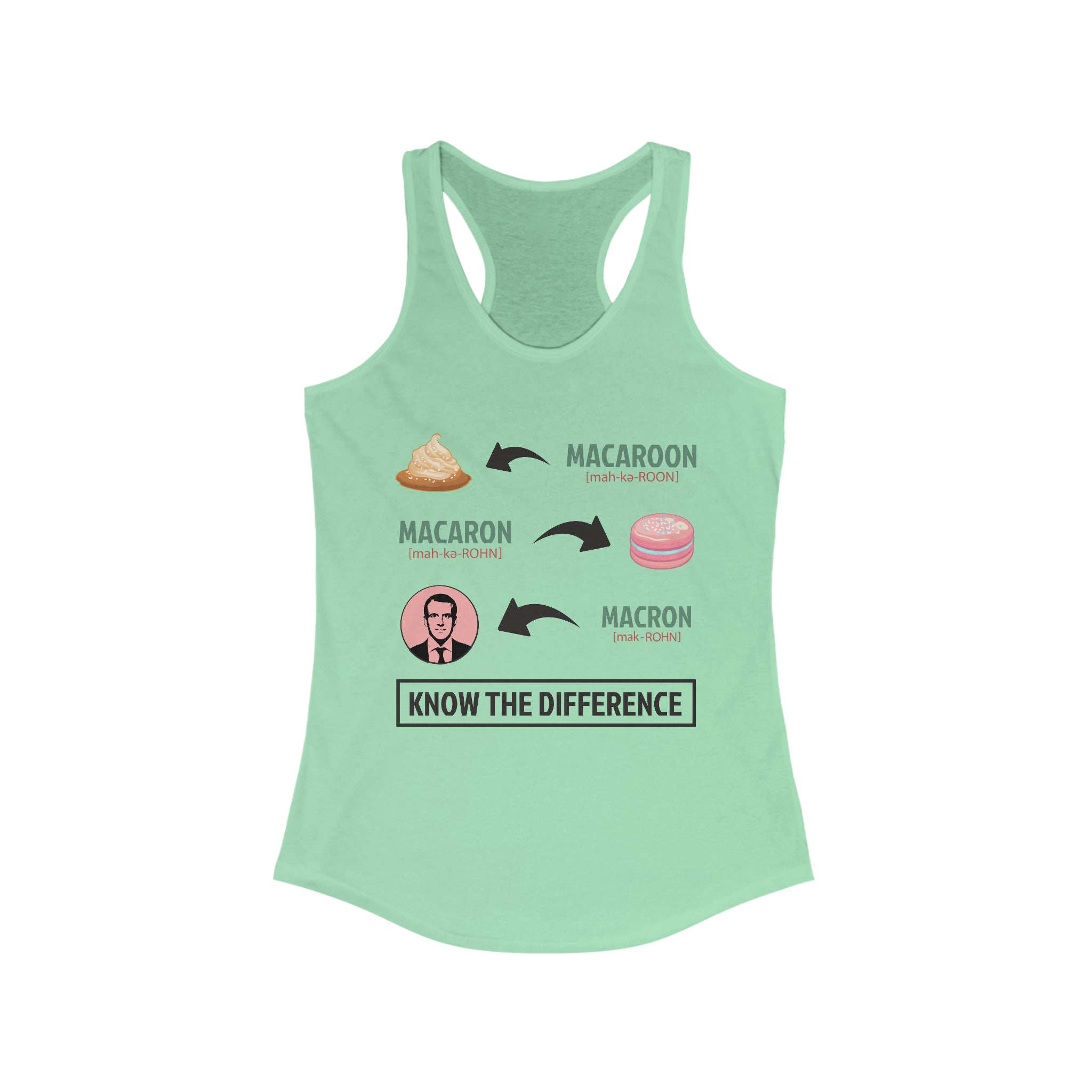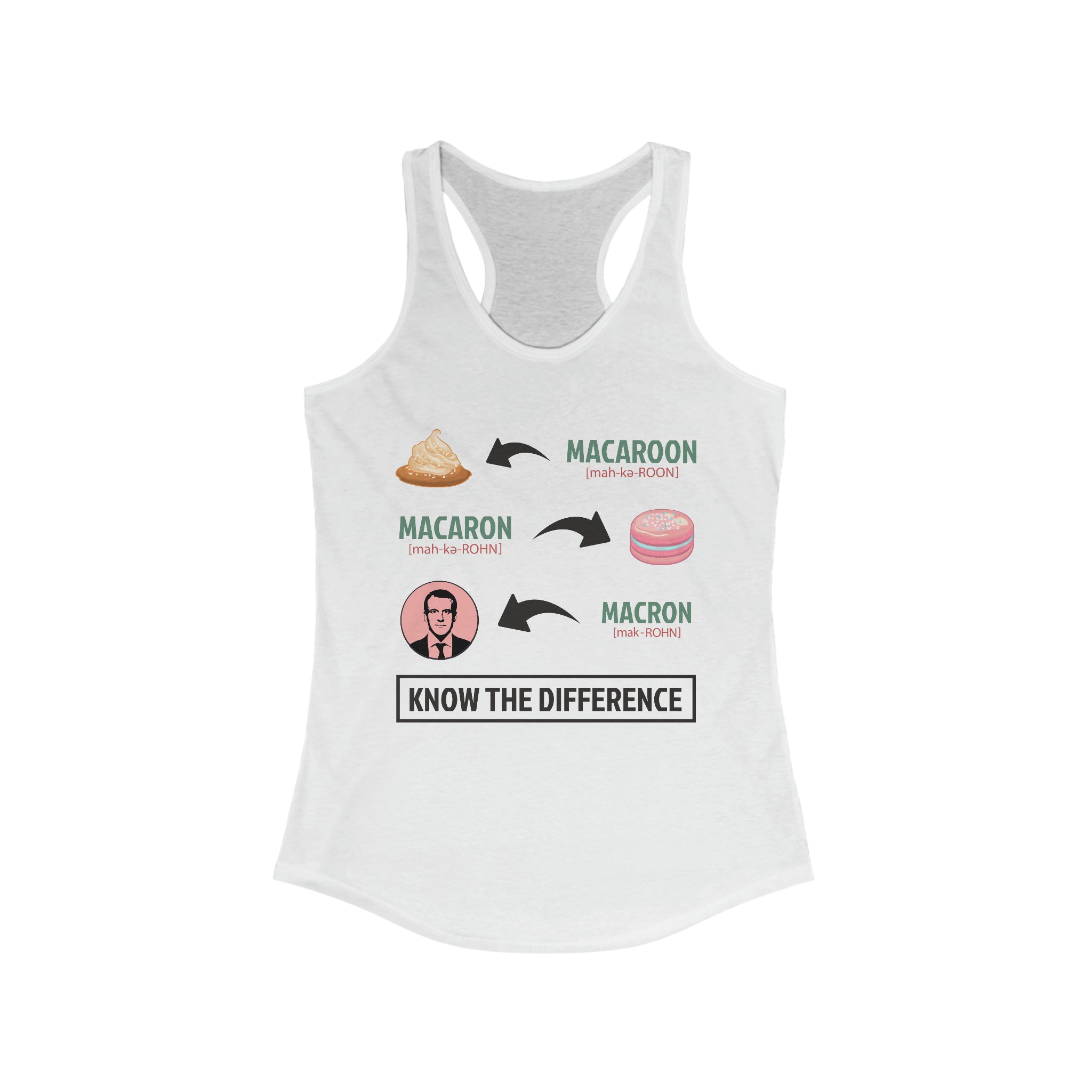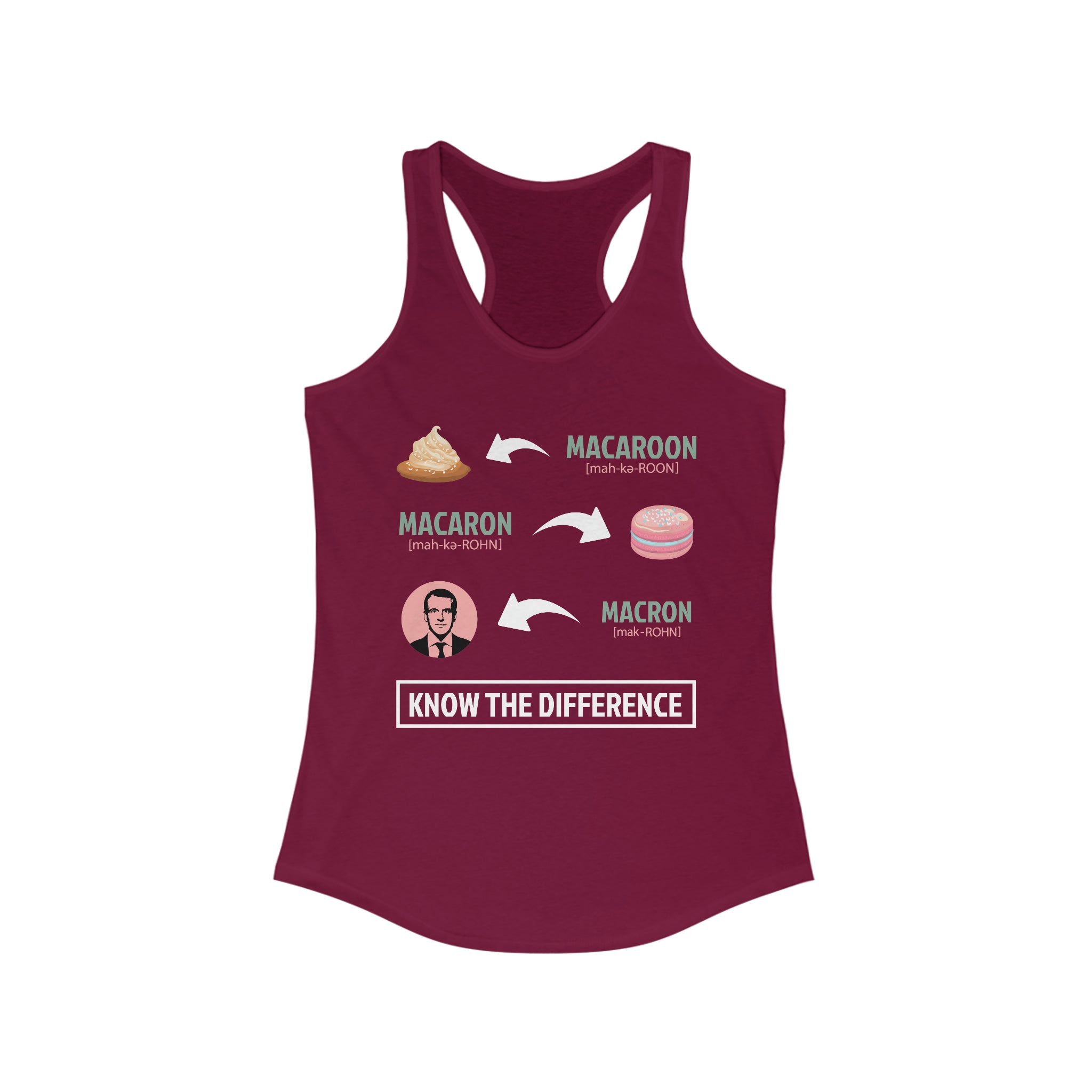 Our funny baking meme shirt features the text "Macroon Macaron Macron - Know the difference" and is the perfect baking gift for your favorite cookie lover! This women's slim-fit racerback tank top comes in 6 colors. PLEASE NOTE - THIS TEE RUNS SMALL - SEE PHOTO AREA FOR SIZING INSTRUCTIONS.
