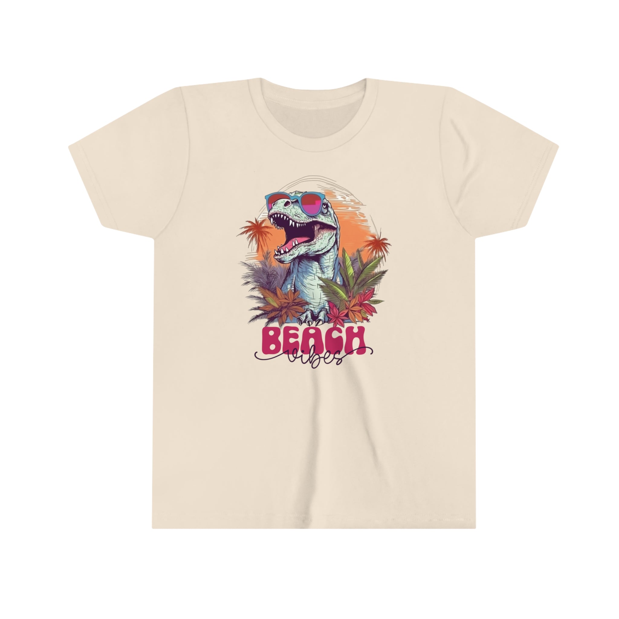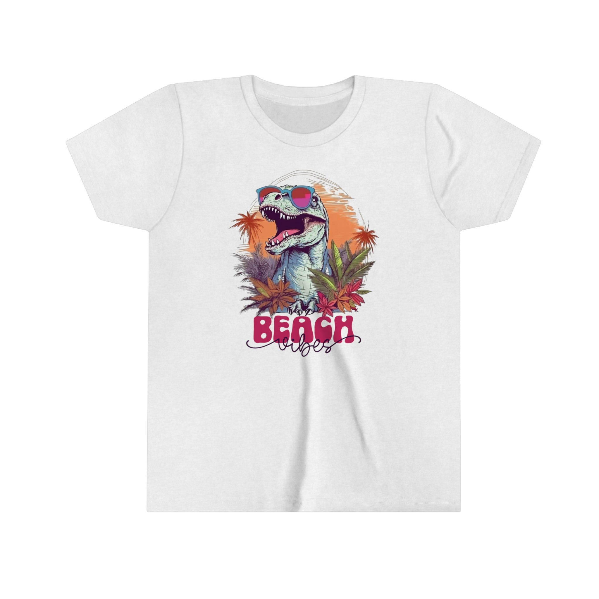 Our Beach Vibes T Rex Shirt is designed to bring a smile to your face and unleash your inner dinosaur lover while embracing the essence of beach life! This youth jersey t-shirt features Beach Vibes text with the sunglasses-wearing t-rex .