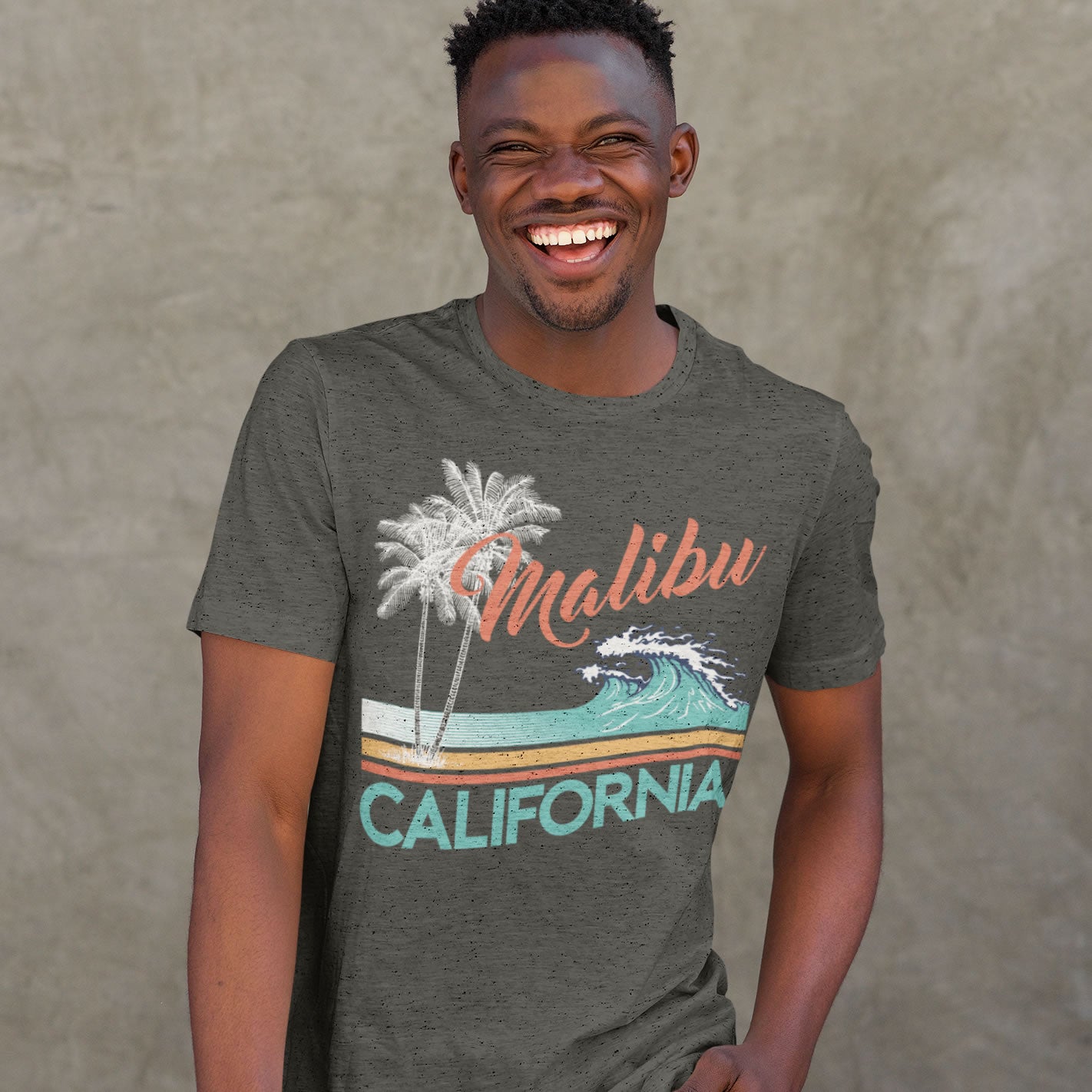 Our Malibu California beach bum shirt is perfect as a surfing gift or for anyone who loves Malibu! This vintage style men's t-shirt comes in 5 colors.