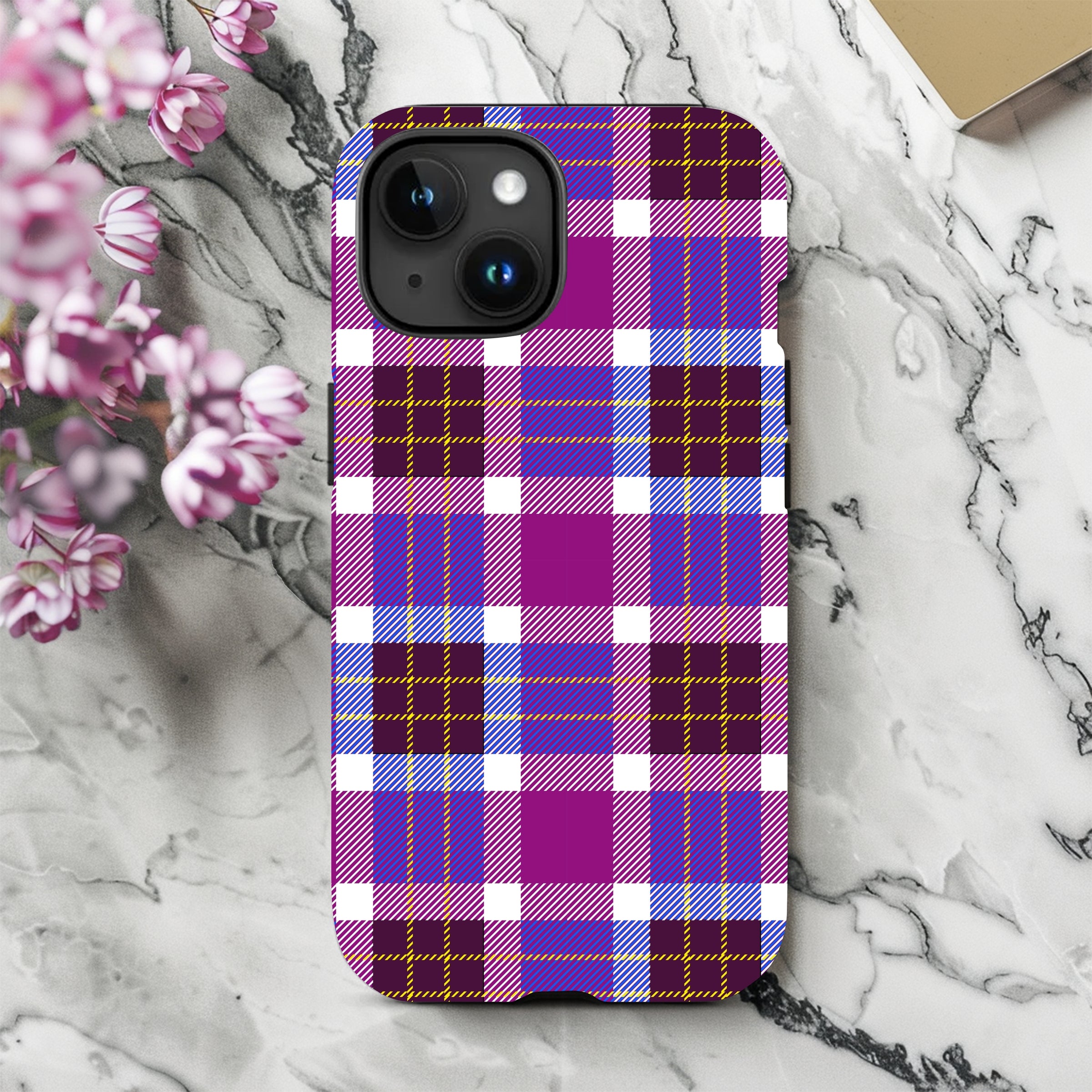 Our purple plaid iPhone Case is a tough and durable phone case designed to protect your iPhone from impacts and scratches. This unique case features a beautifu plaidpattern in different shades of purple that is perfect Christmas gift or for anyone who wants that extra protection and strength! You can select from any of the iPhone 15, 14, 13, 12, and 11 models in the dropdown.