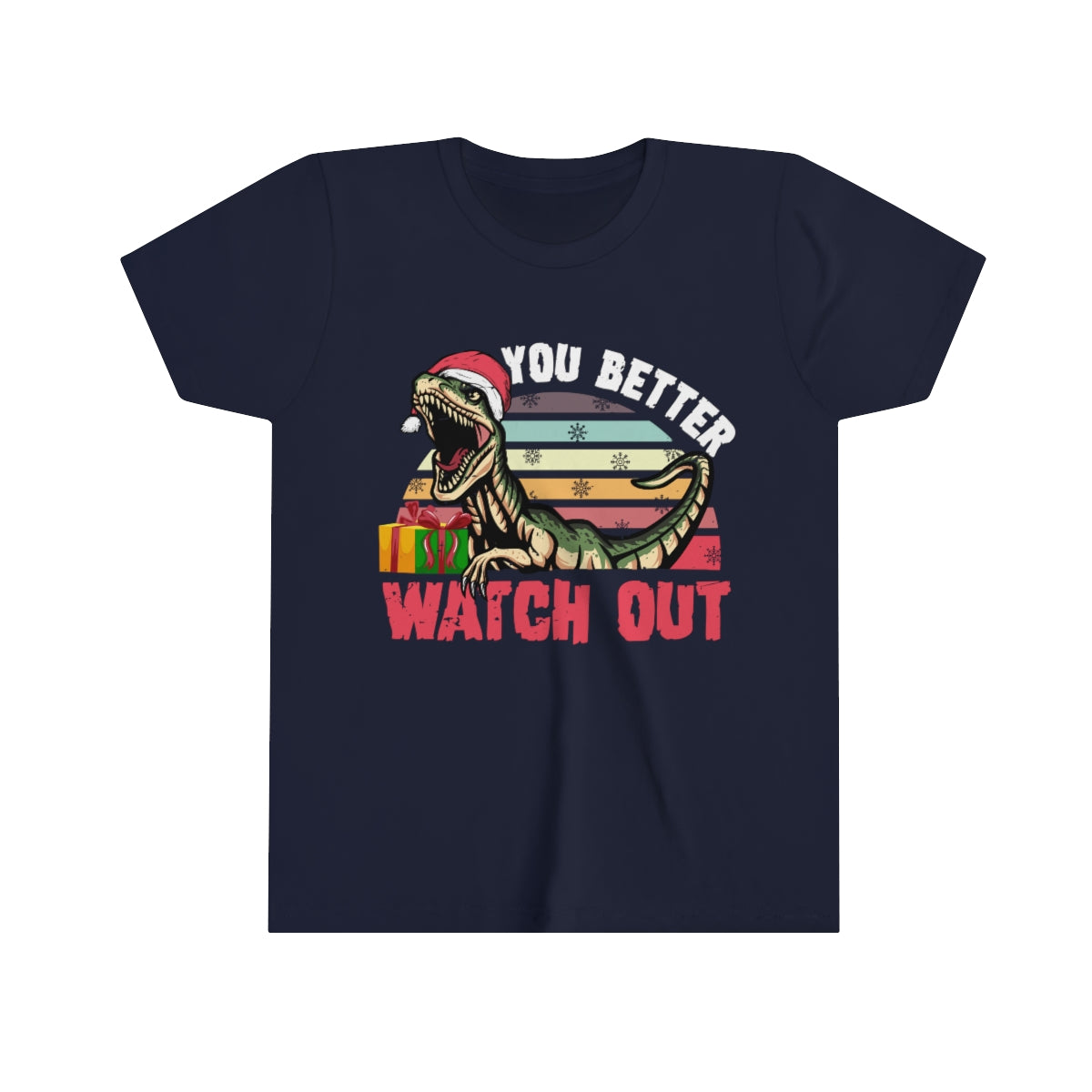 Our funny dinosaur Christmas shirt features a velociraptor Santa and the text "You Better Watch Out" and it makes a perfect Christmas gift for any dinosaur lover! This unisex jersey youth t-shirt comes in 2 colors.
