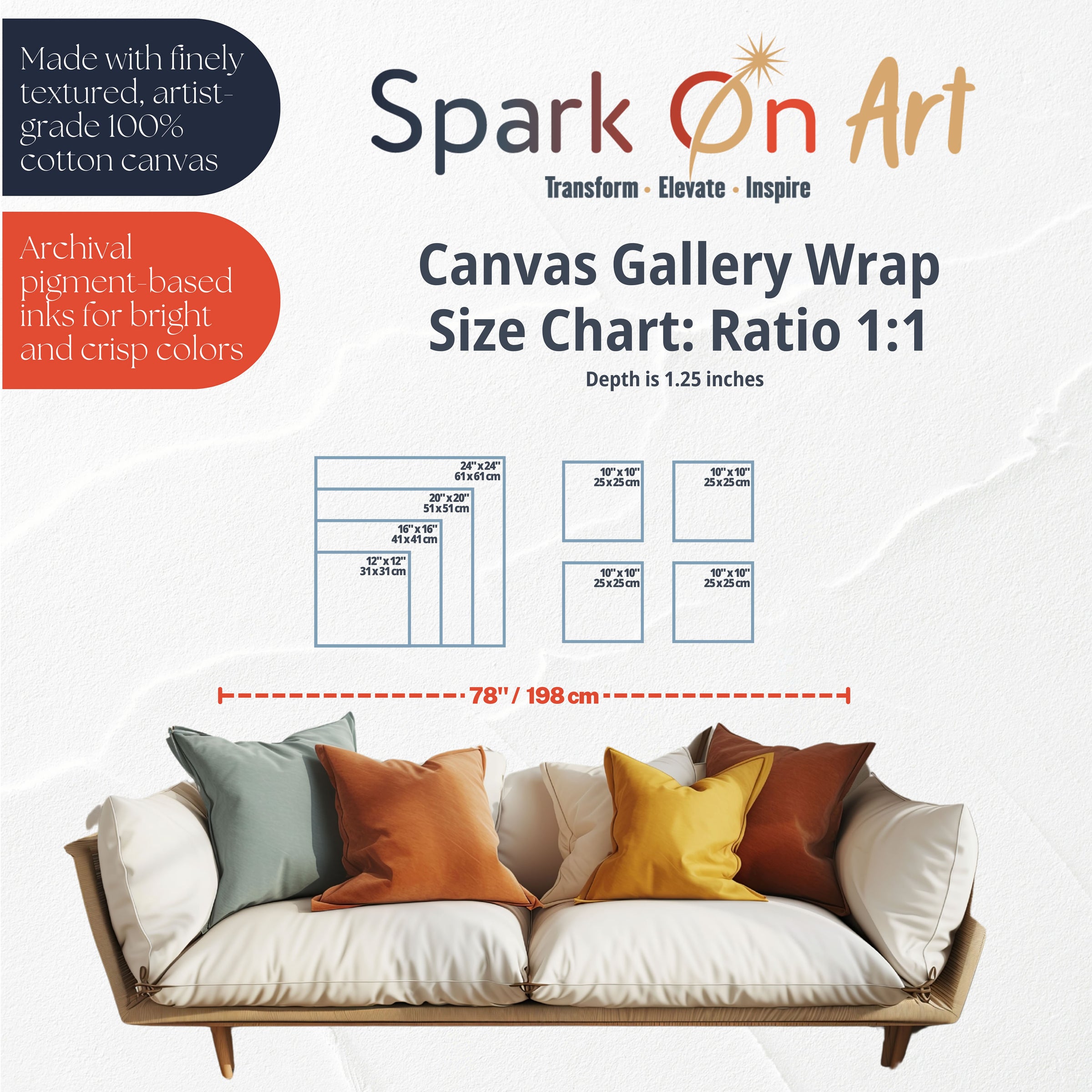 Sizes: 10" x 10" / 12" x 12" / 16" x 16" / 20" x 20" - Depth is 1.25 inches CARE INSTRUCTIONS If the canvas does gather any dust, you may wipe it off gently with a clean, damp cloth.
