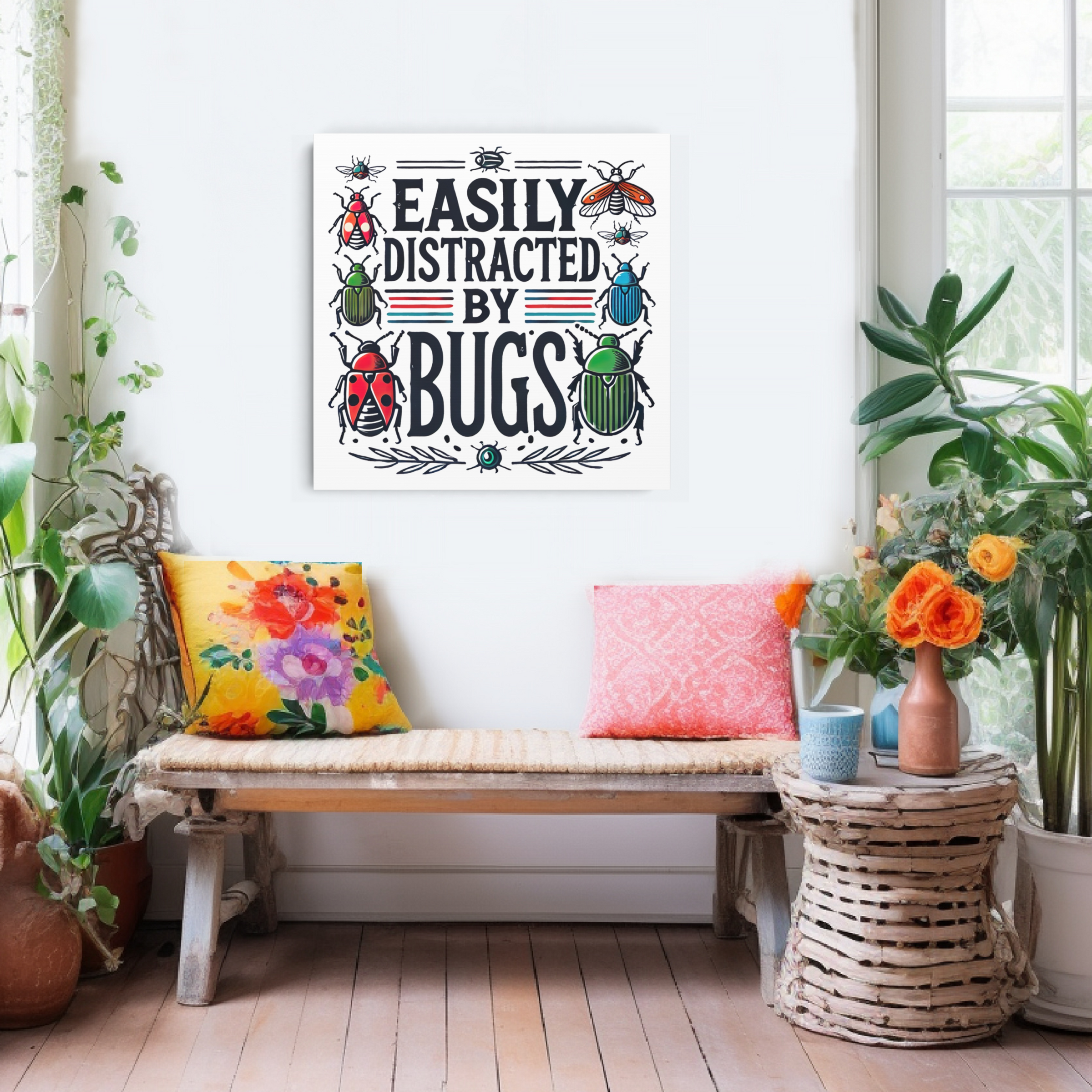 Our funny insect wall art features the text "Easily Distracted by Bugs", and it's the perfect nature lover gift for anyone who loves bugs and entomology! This bug lover home decor wall art is printed on 100% cotton canvas and comes in 4 sizes.