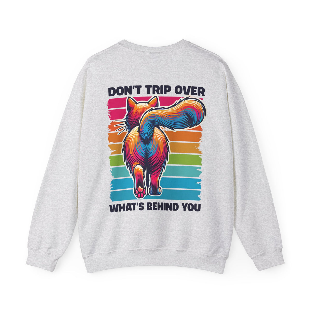 Don't Trip Over What's Behind You Funny Cat Shirt | Self-Love Cat Lover Shirt | Positive Motivational Shirt | Unisex Crewneck Sweatshirt