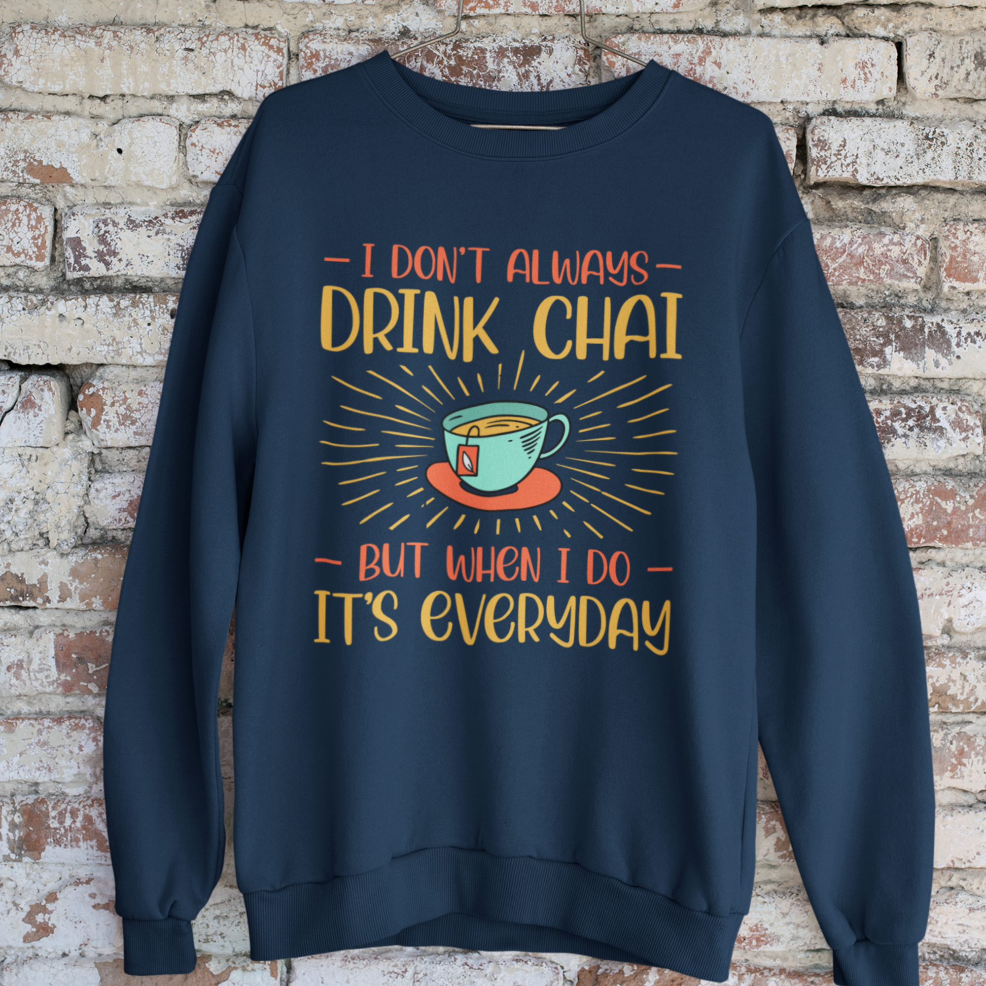 This playful yet elegant t-shirt design features the phrase "I Don’t Always Drink Chai, but When I Do It’s Everyday” and is perfect for all chai enthusiasts! Whether you are a tea lover or fan of Indian culture, you will love this super soft comfy sweatshirt!