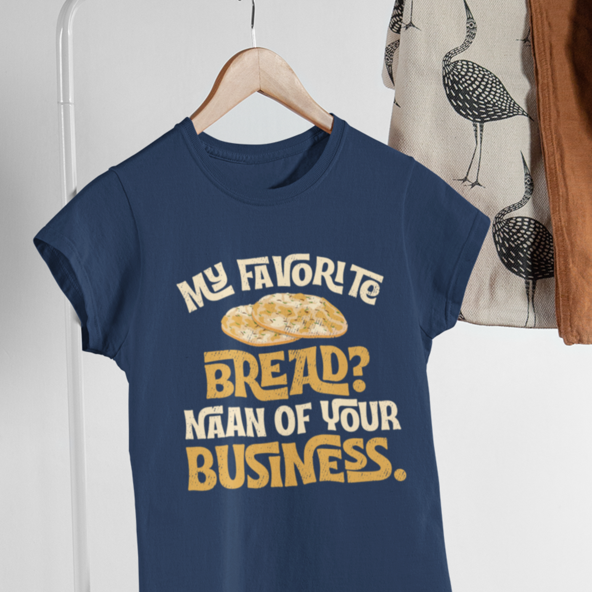 Our Naan bread shirt features the text "My favorite bread? Naan of your business" and it's a perfect Indian gift for anyone who loves Indian food! This funny shirt is a women's slim-fit t-shirt that comes in 5 colors. PLEASE NOTE - THIS TEE RUNS SMALL - SEE PHOTO AREA FOR SIZING INSTRUCTIONS.