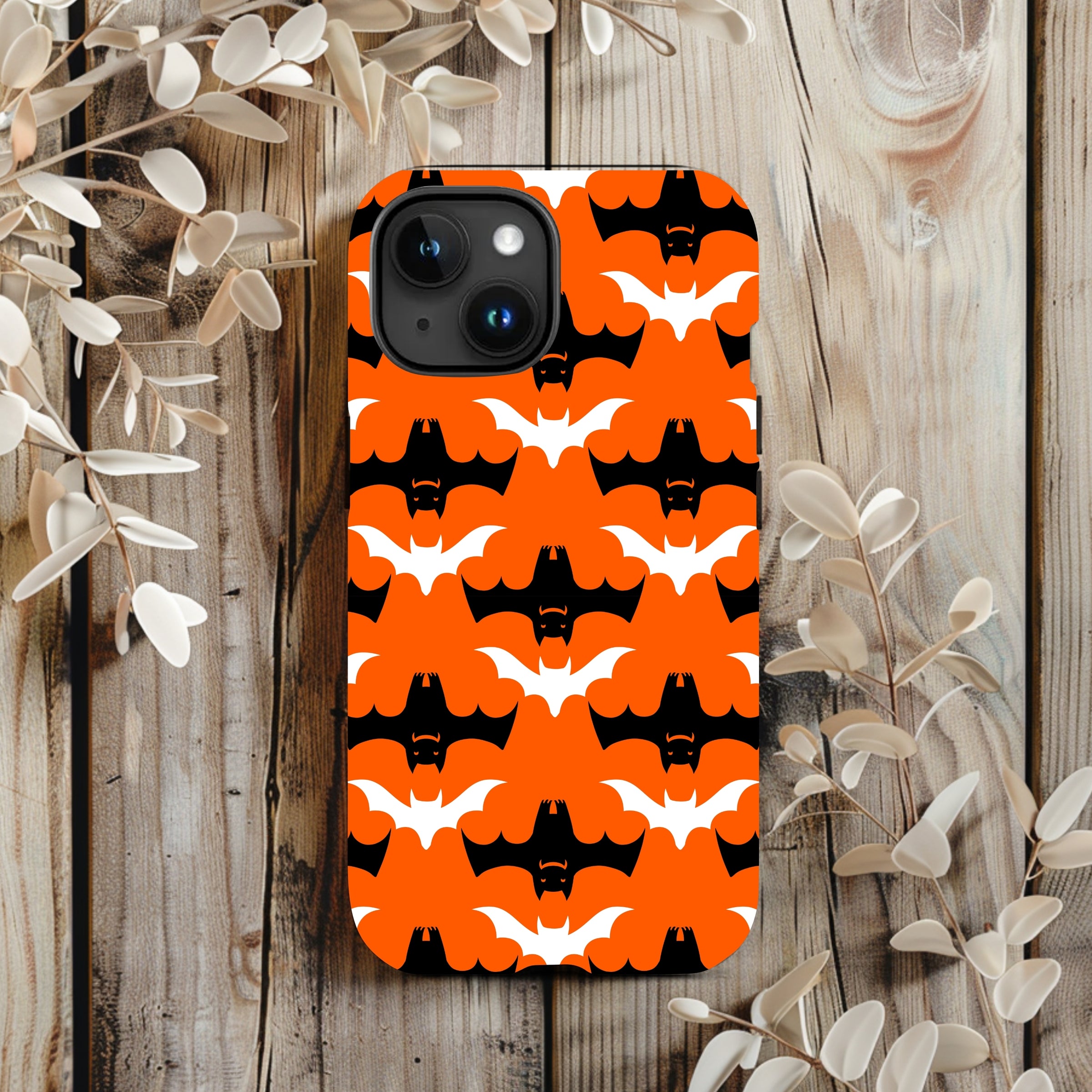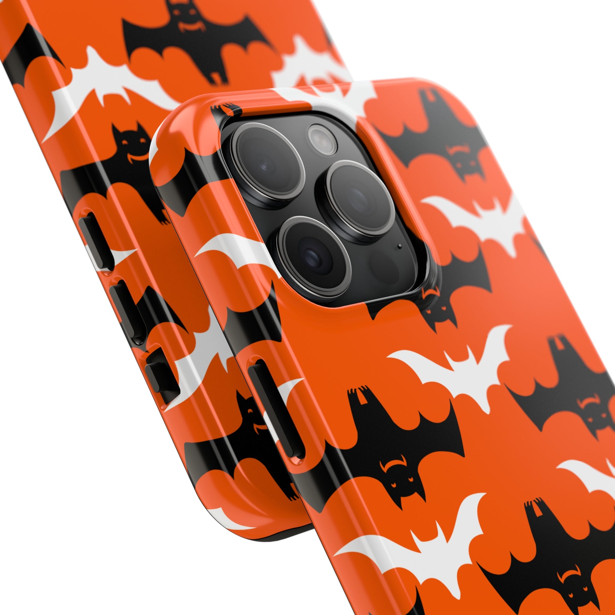 Our Halloween bat iPhone Case is a tough and durable phone case designed to protect your iPhone from impacts and scratches. This unique case features a cute black, white, and orange bat pattern This phone case is a perfect Halloween gift for anyone who wants that extra protection and strength! You can select from any of the iPhone 15, 14, 13, 12, and 11 models in the dropdown.