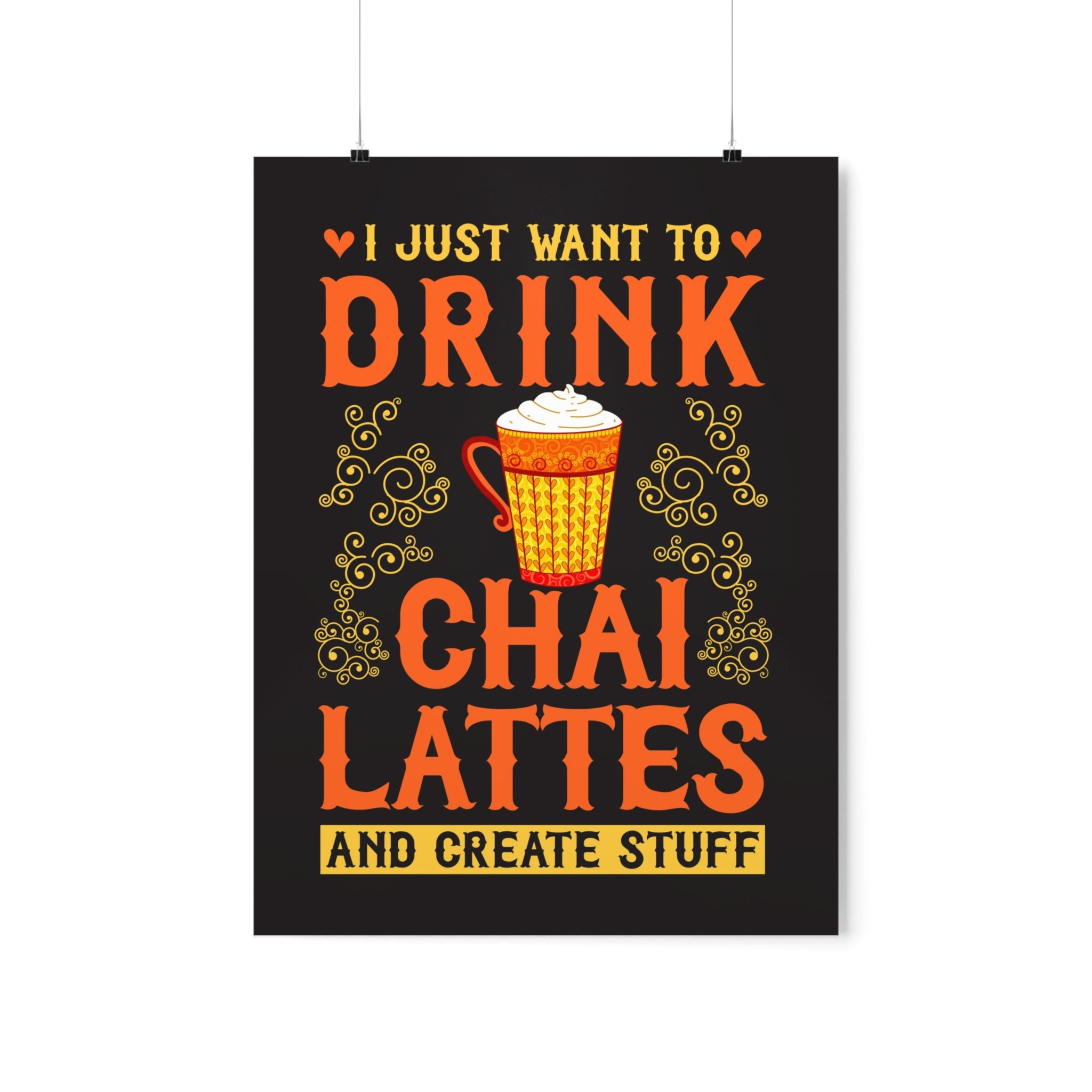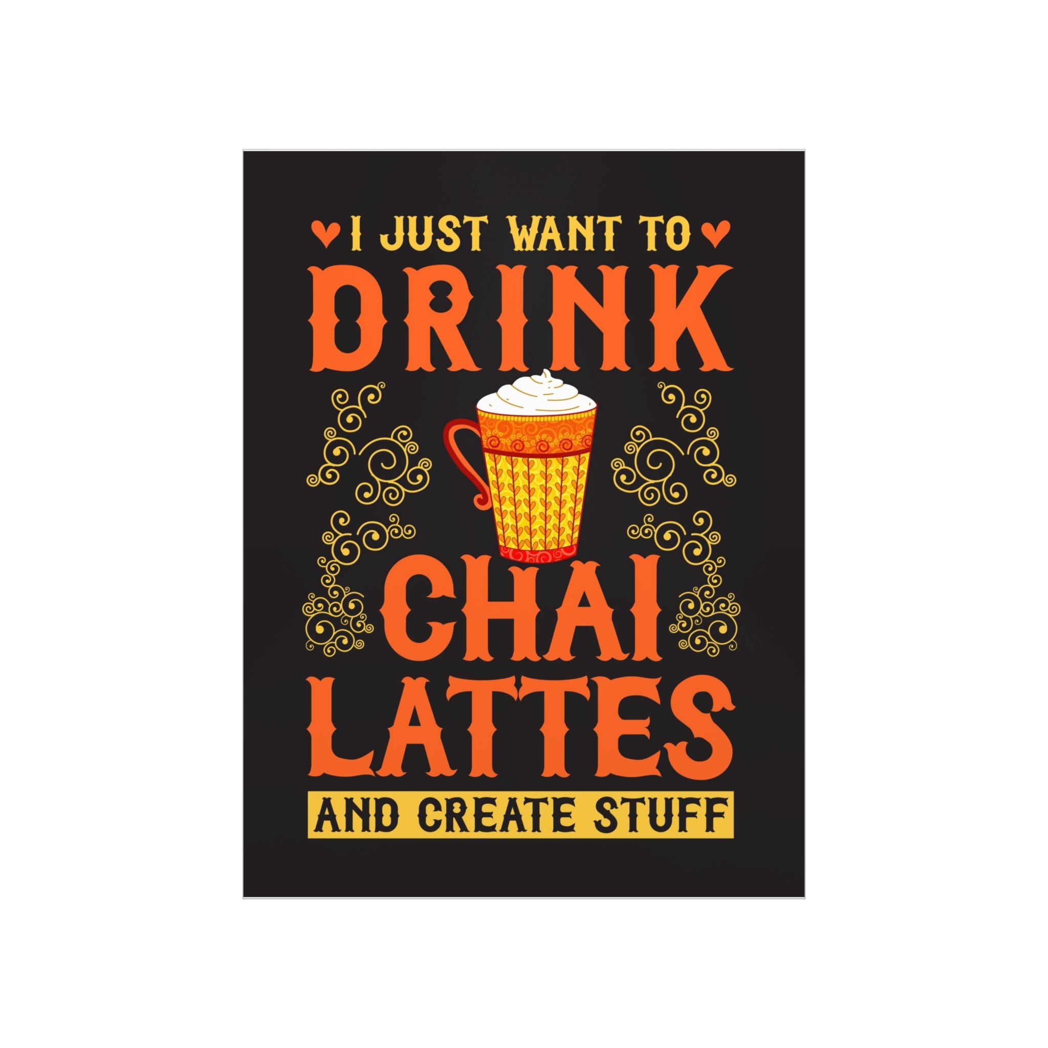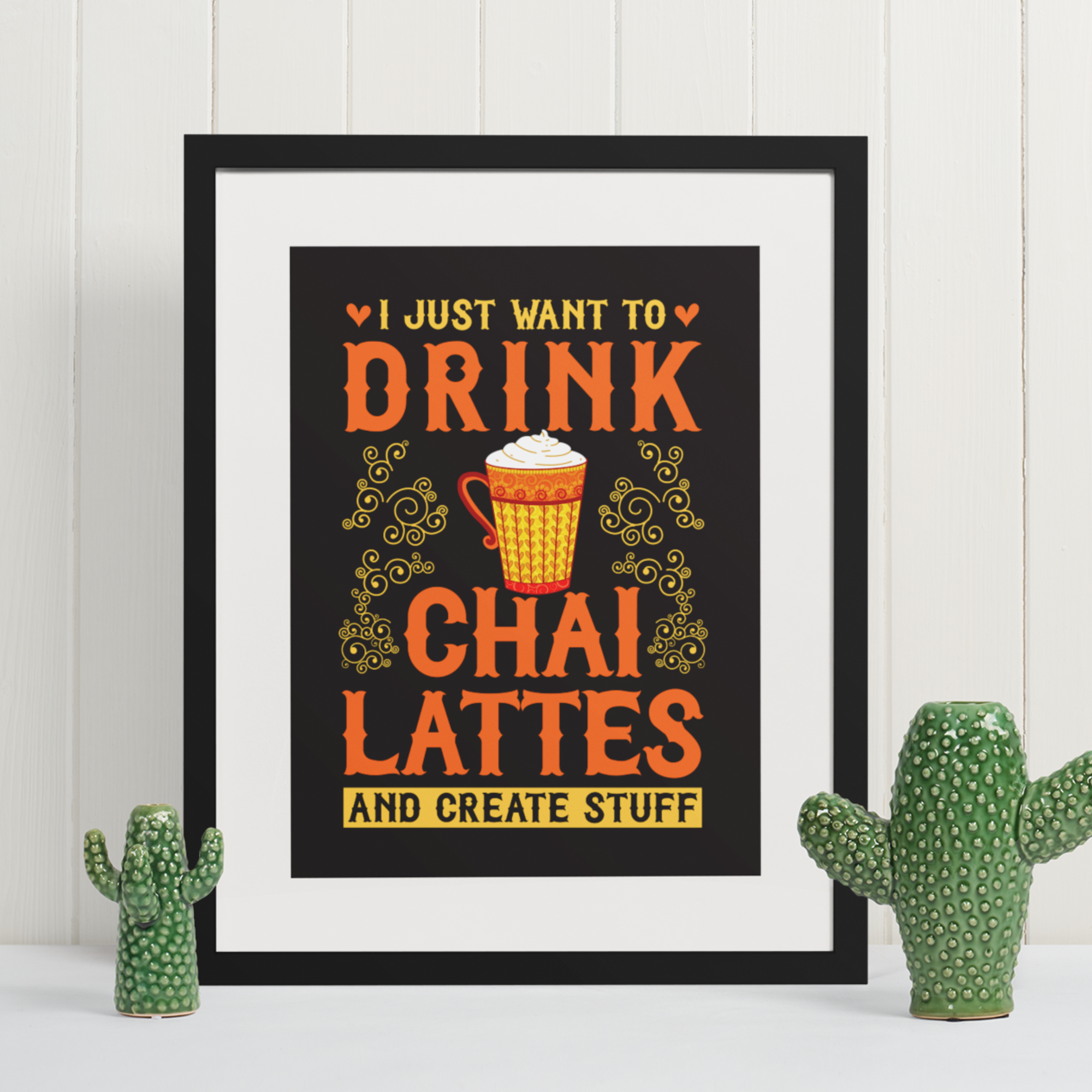 Our chai latte tea wall art print features the text "I just want to drink chai lattes and create stuff" and is the perfect tea gift for a crafter or creative designer who is also a serious tea drinker! The print is on a high quality, matte finish fine art paper ready for whatever framing you decide on! It's available in18" x 24". FRAME NOT INCLUDED.