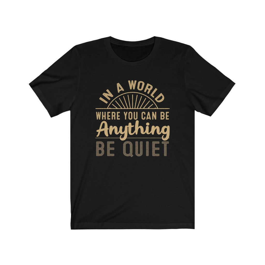 Our funny antisocial shirt features the text "In a world where you can be anything, be quiet" and is a perfect leave me alone gift for your favorite introvert! This introvert shirt is a Bella Canvas unisex jersey t-shirt that comes in 3 colors.