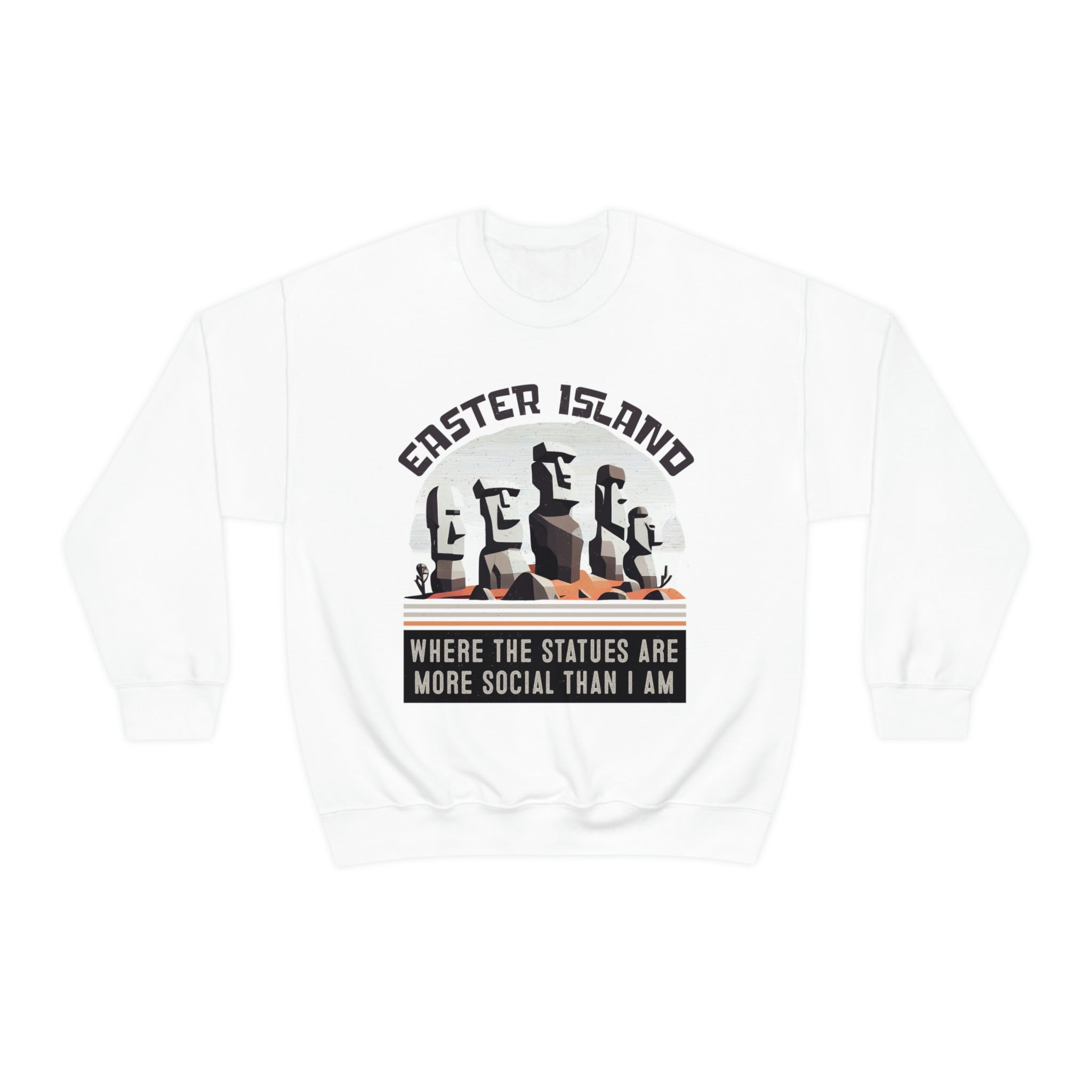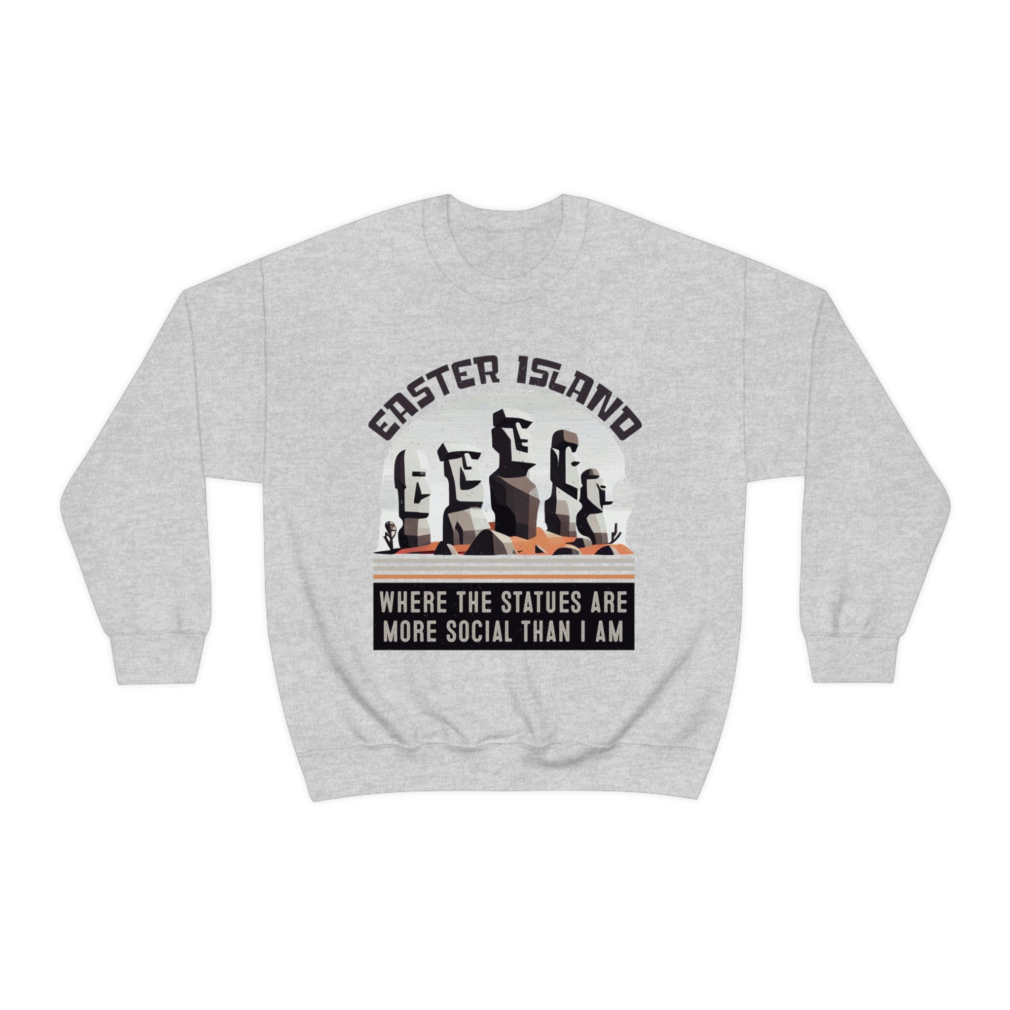 Our Easter Island shirt is a unique and quirky crewneck sweatshirt designed for individuals who identify as introverted or antisocial! This introvert shirt features the traditional Moai Head statues from Easter Island with the text" Ester Island - Where the statues are more social than I am". This shirt is a funny gift for men or women and it's perfect for wearing on a casual day out or for lounging around the house in comfort.