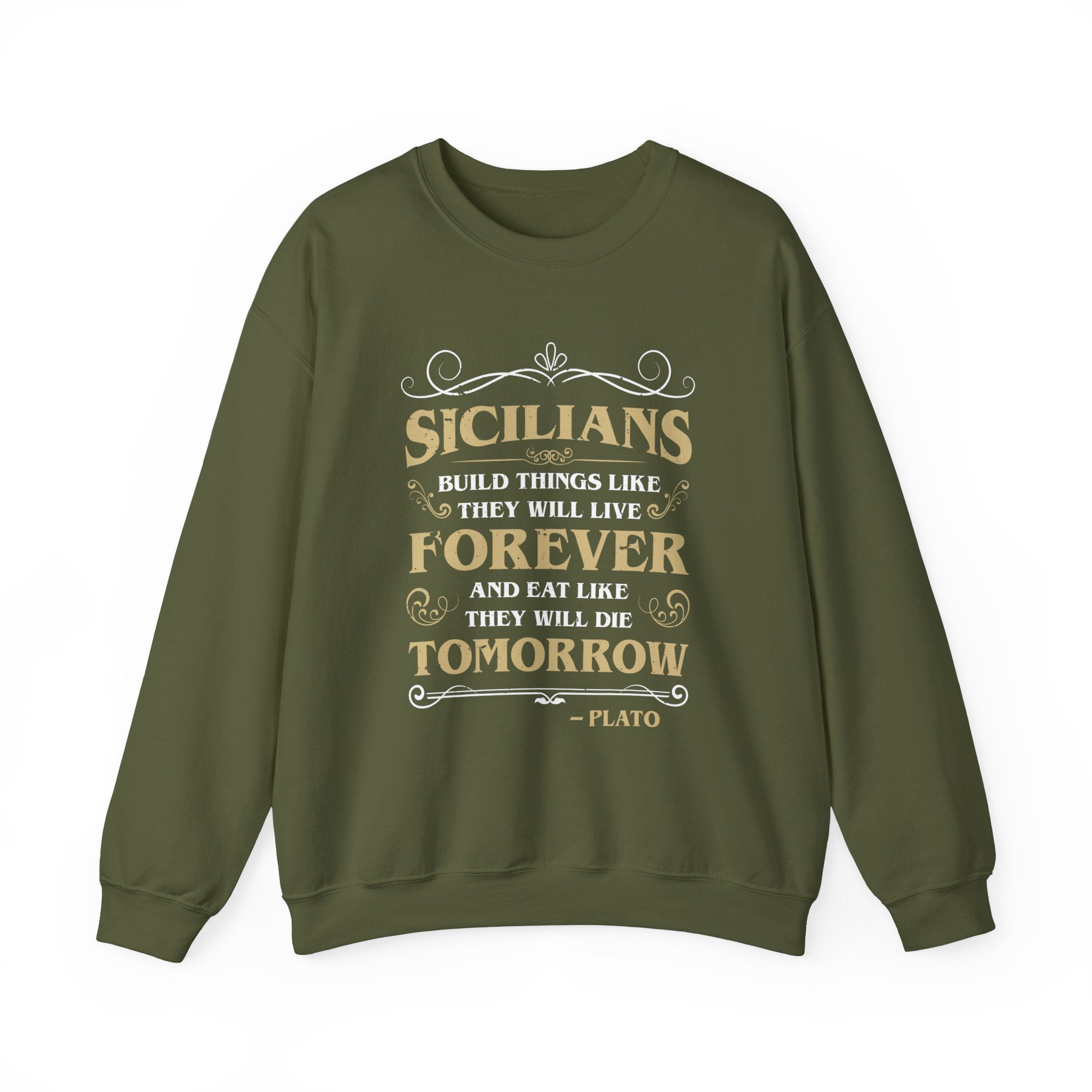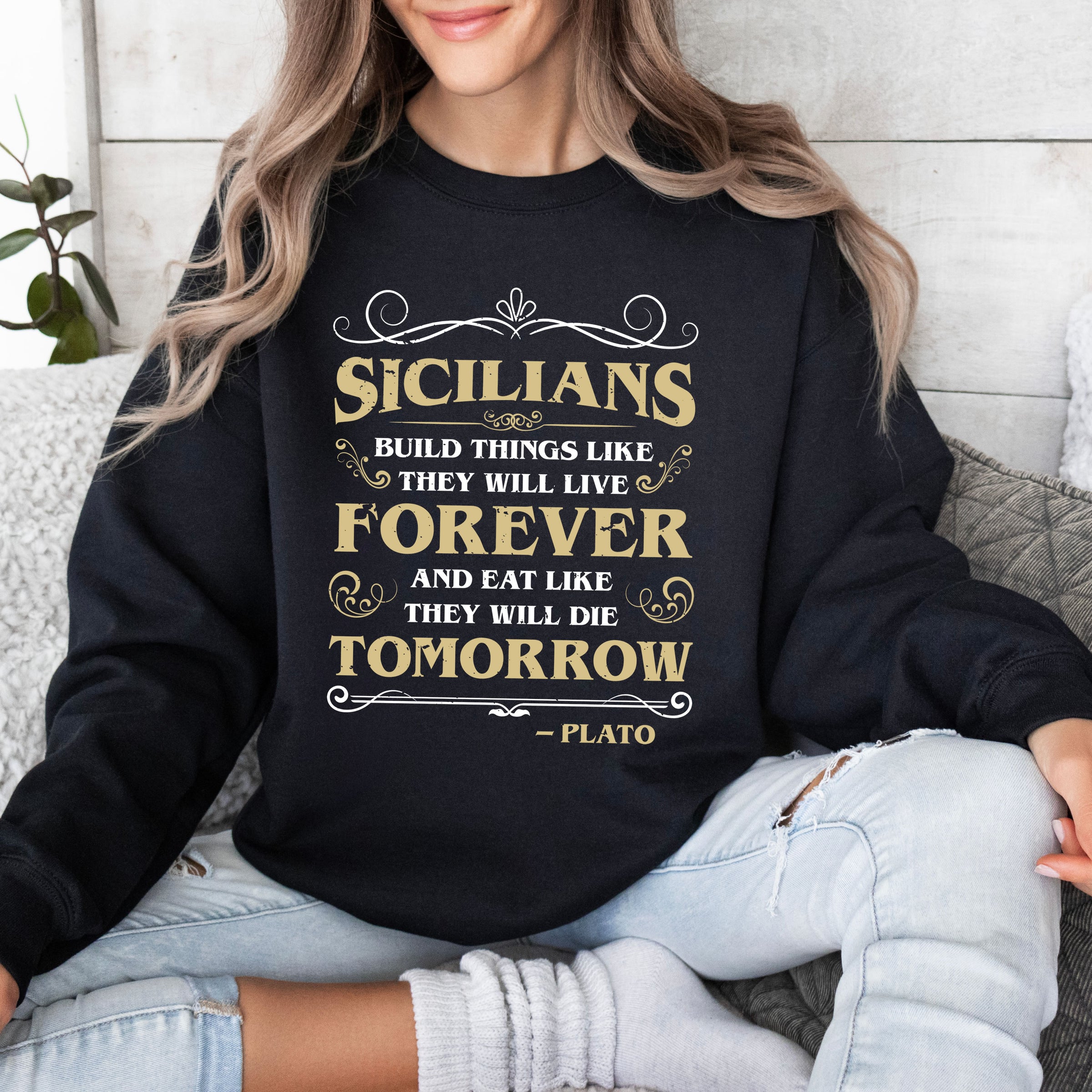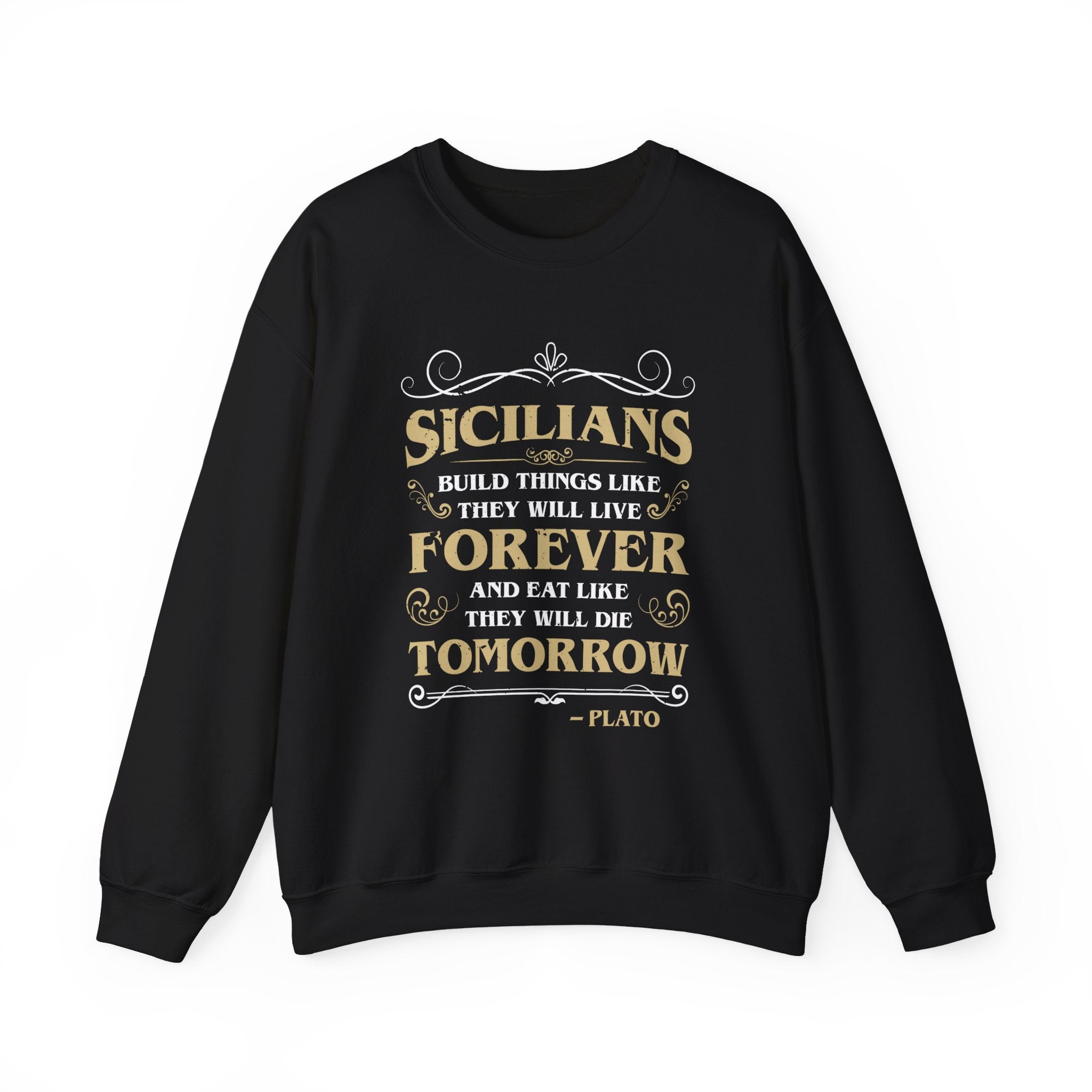 Our funny Italian shirt features the Plato quote: Sicilians build things like they will last forever and eat like they will die tomorrow" and is a perfect Italy gift for your favorite Sicilian! This unisex crewneck sweatshirt comes in 6 colors.