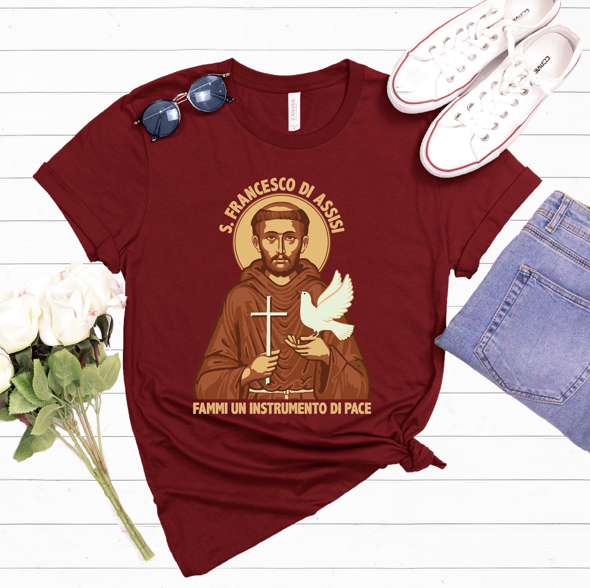 Our St Francis Prayer Catholic t-shirts feature the likeness of St Francis of Assisi (Saint Francis) and the text Fammi Un Instrumento di Pace (Make me an Instrument of Peace) and make the best Italy gifts or best saint gifts for anyone who wants to pay homage to his legacy. St Francis was an Italian saint that advocated for peace, animals, and the environment becoming an example of humility and serving others.