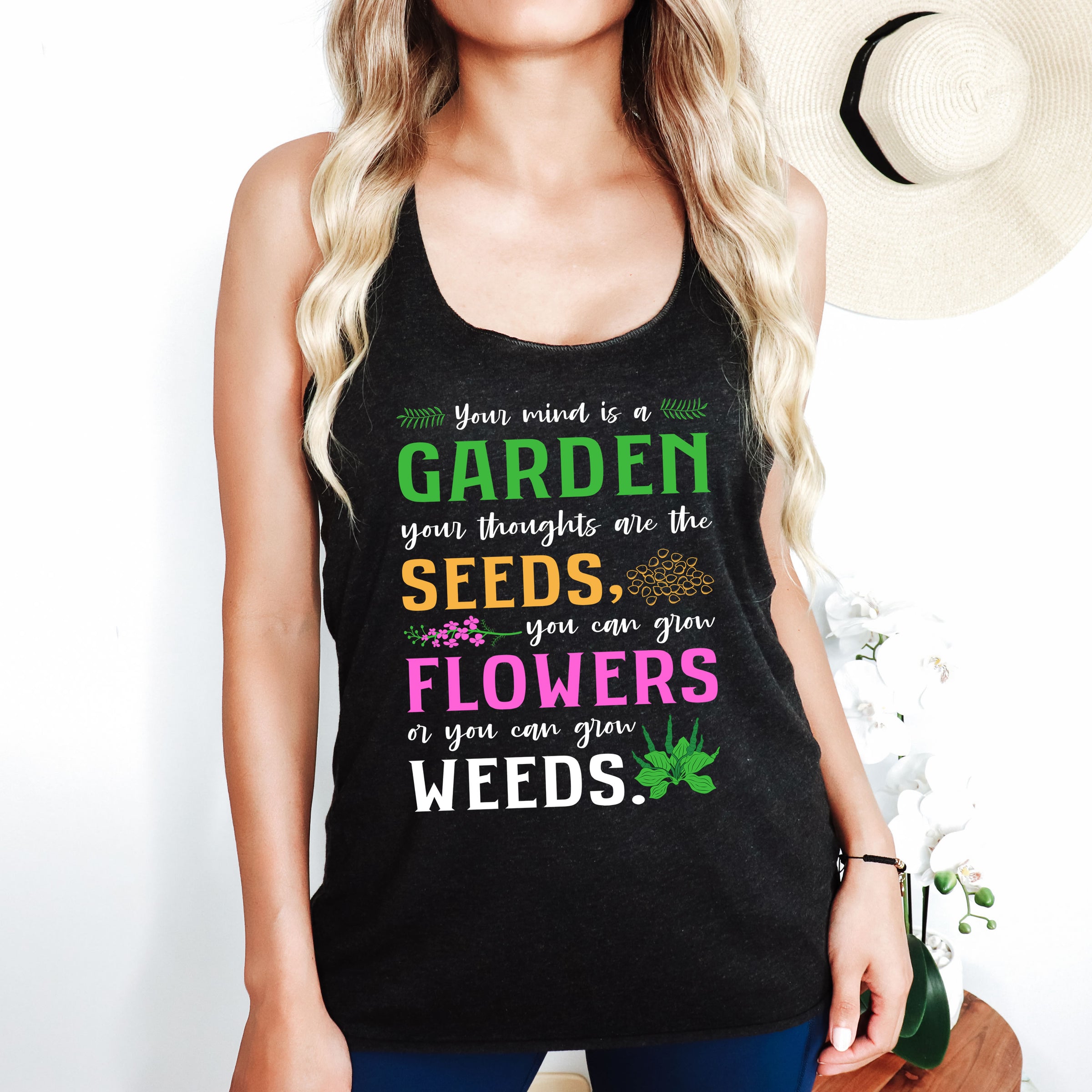 Our mindfulness shirt features the text "Your mind is a garden, your thoughts are the seeds, you can grow flowers, or you can grow weeds" and is a great mindfulness gift for a school psychologist or anyone interested in psychology and mindfulness! This women's racerback tank top comes in black heather.