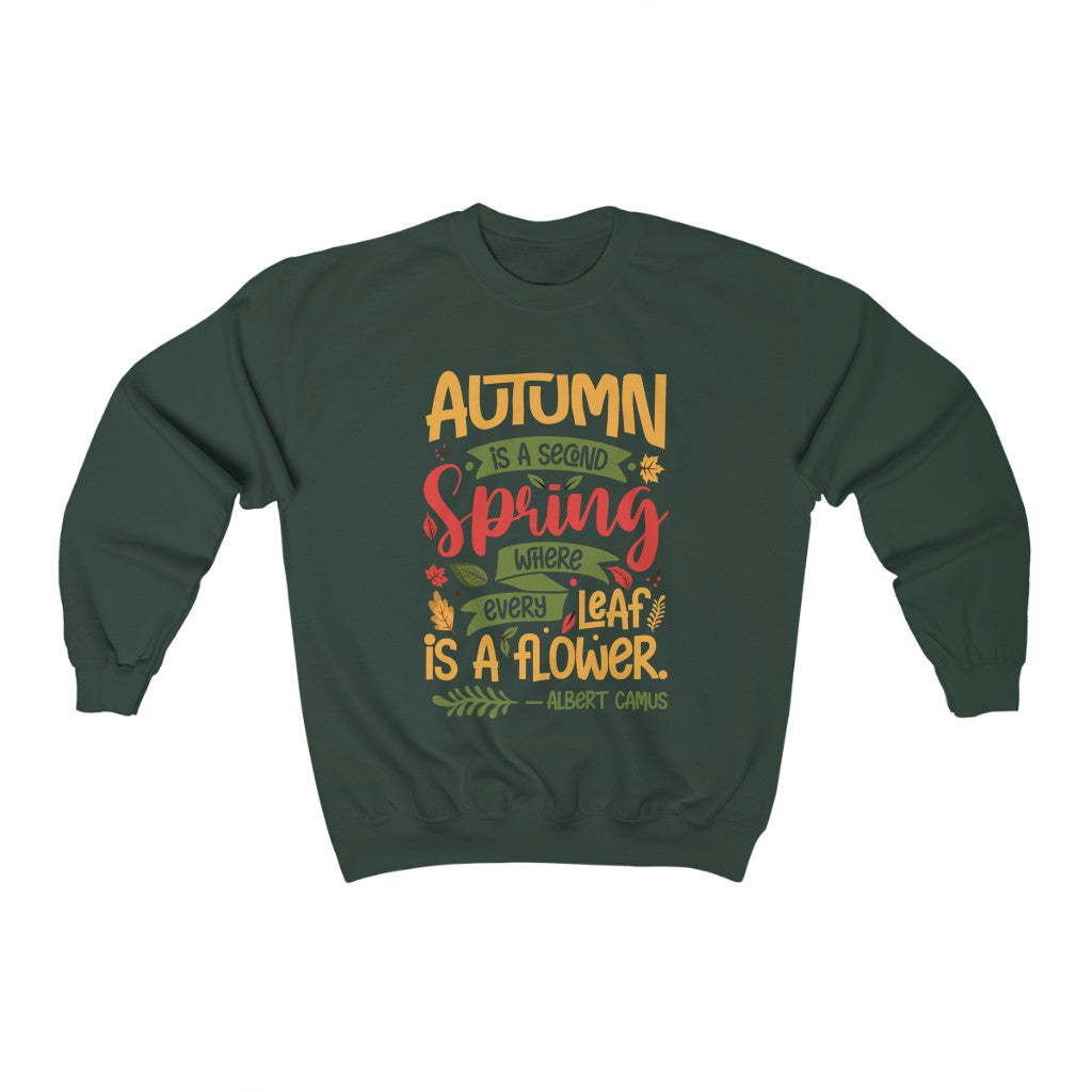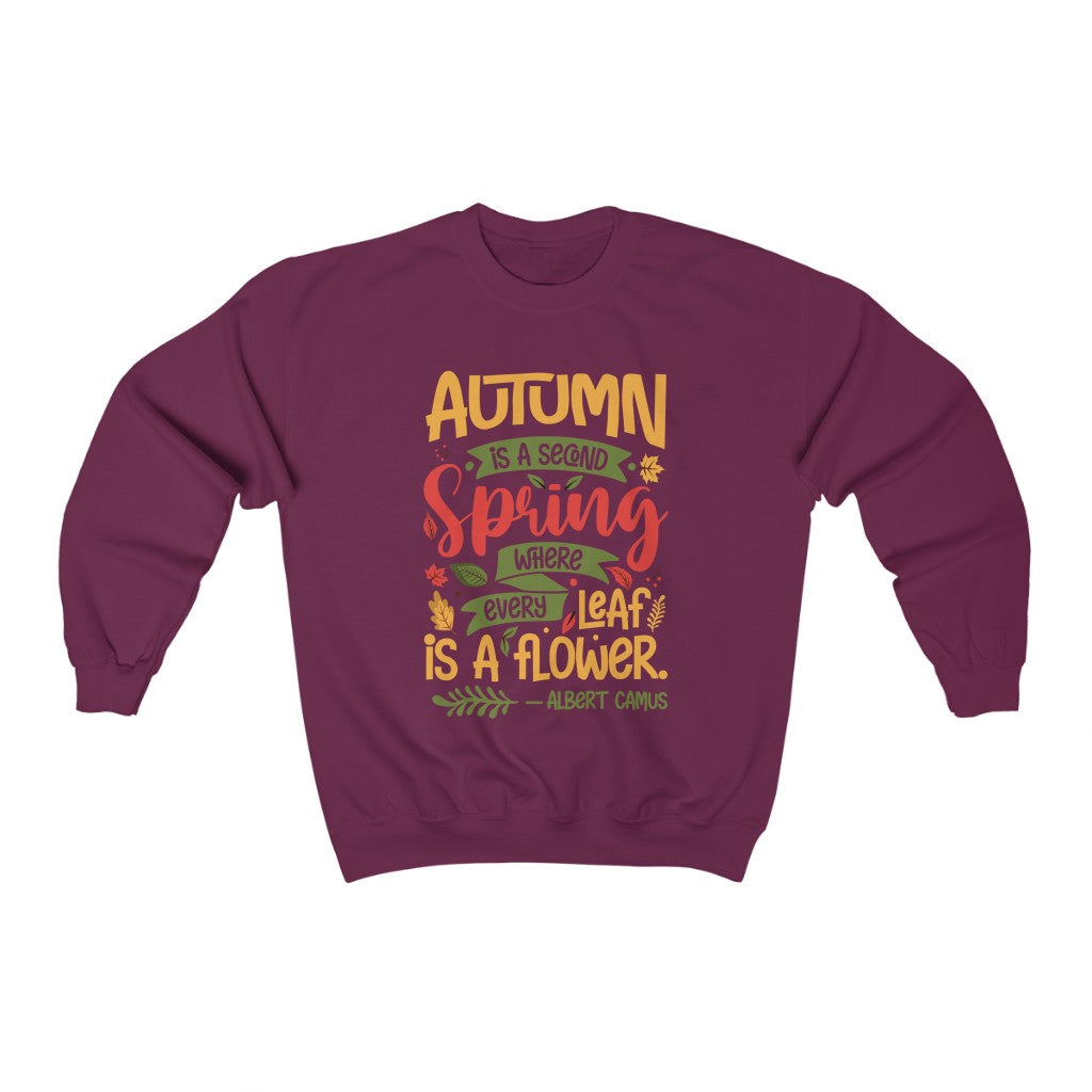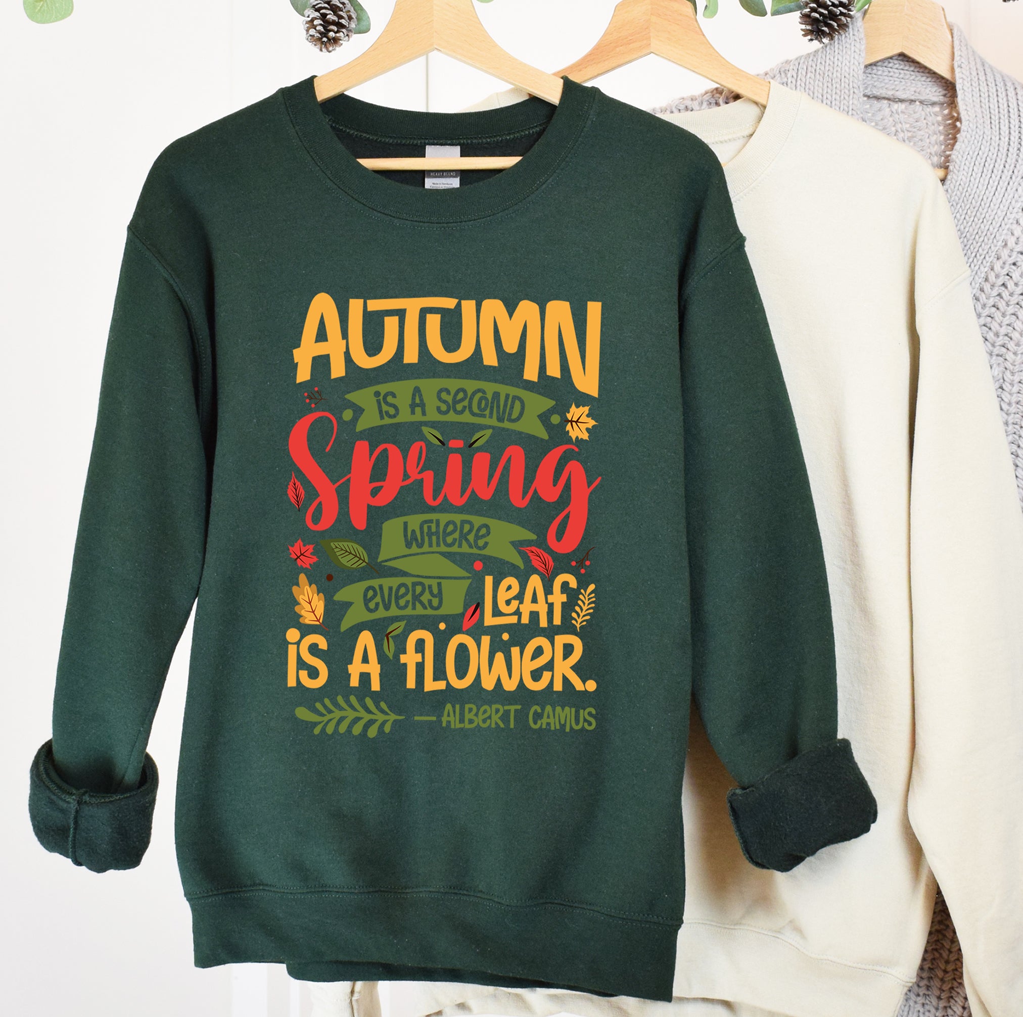 Our Fall Albert Camus Quote shirt features the text "Autumn is a second Spring where every leaf is a flower". This flower shirt is a unisex crewneck sweatshirt that comes in 4 colors.