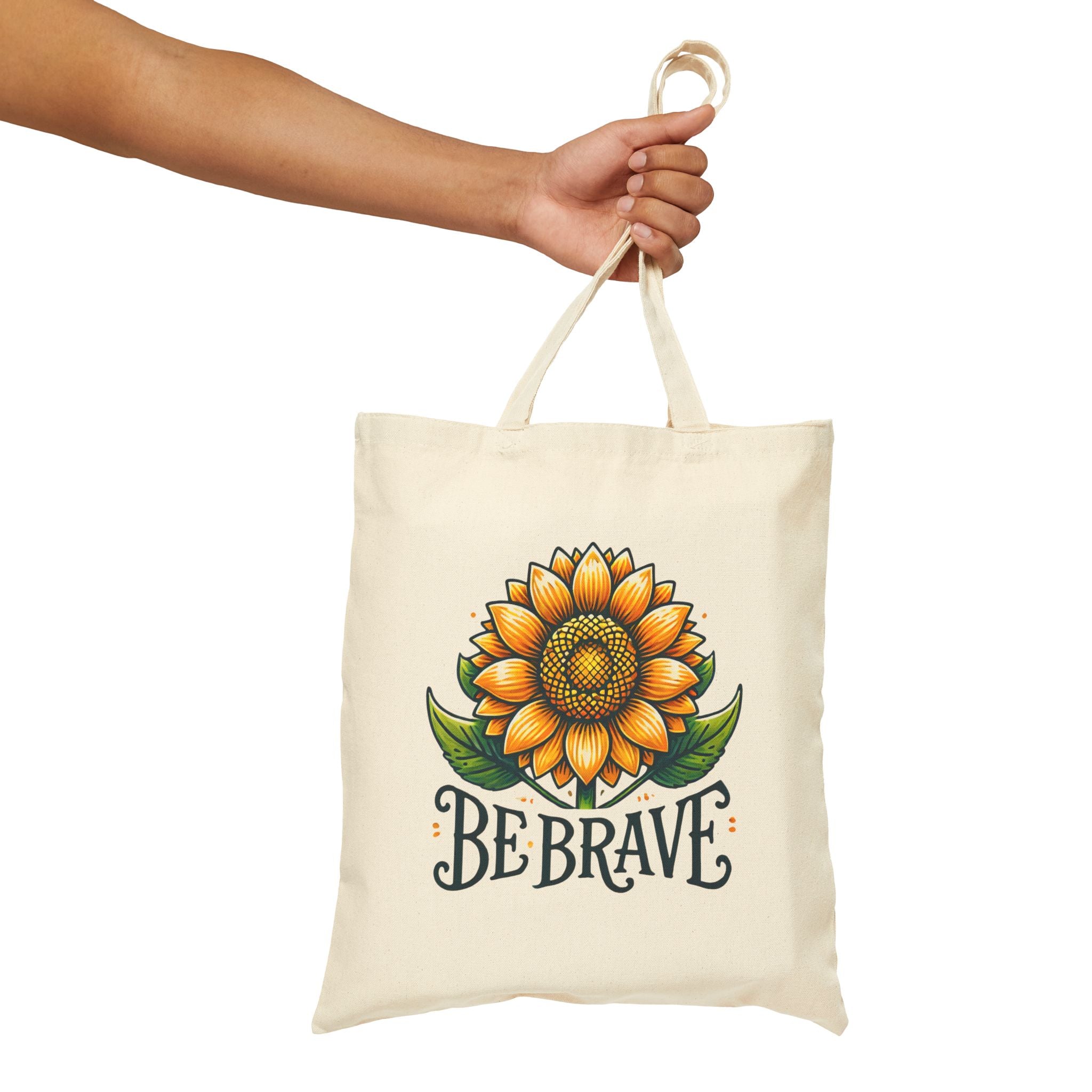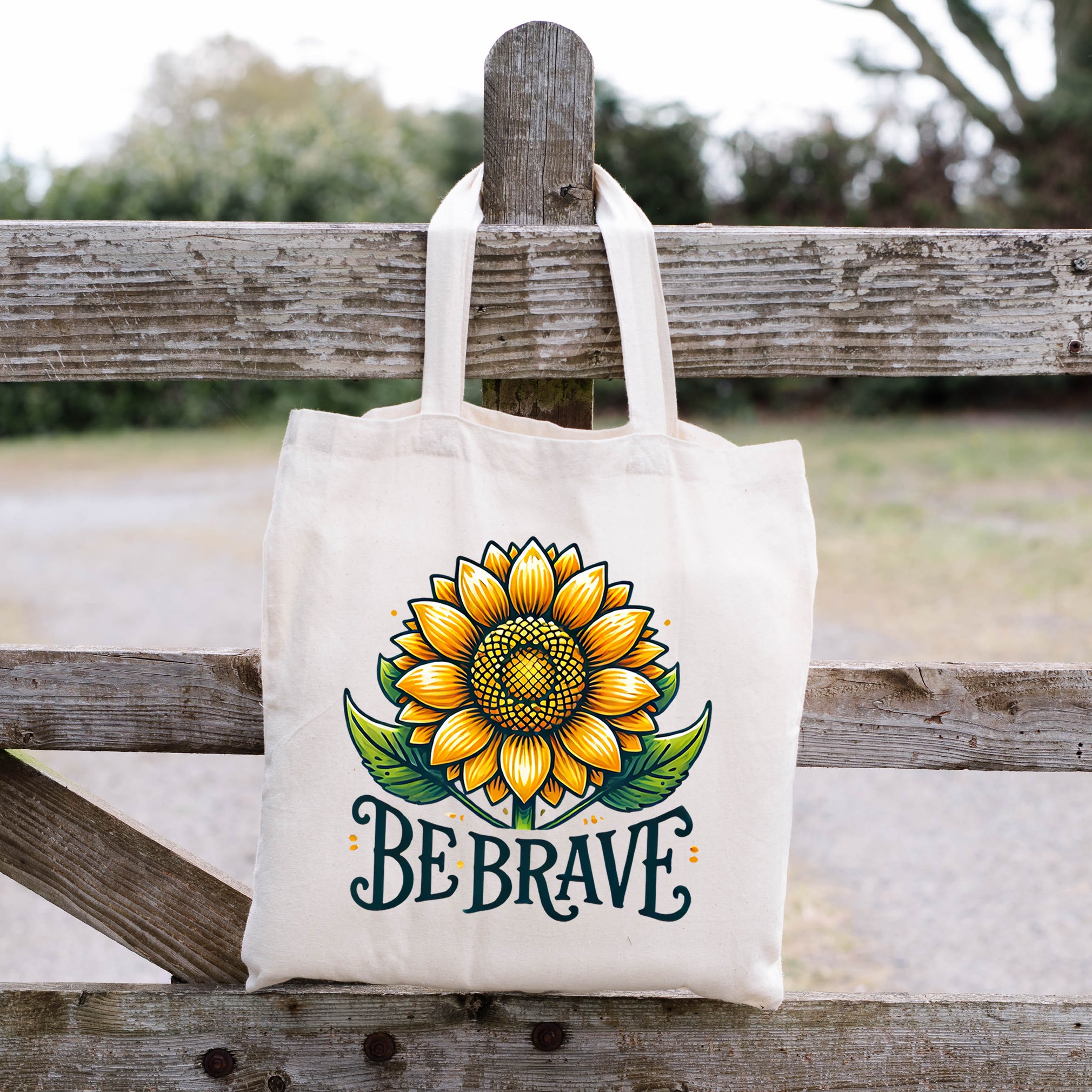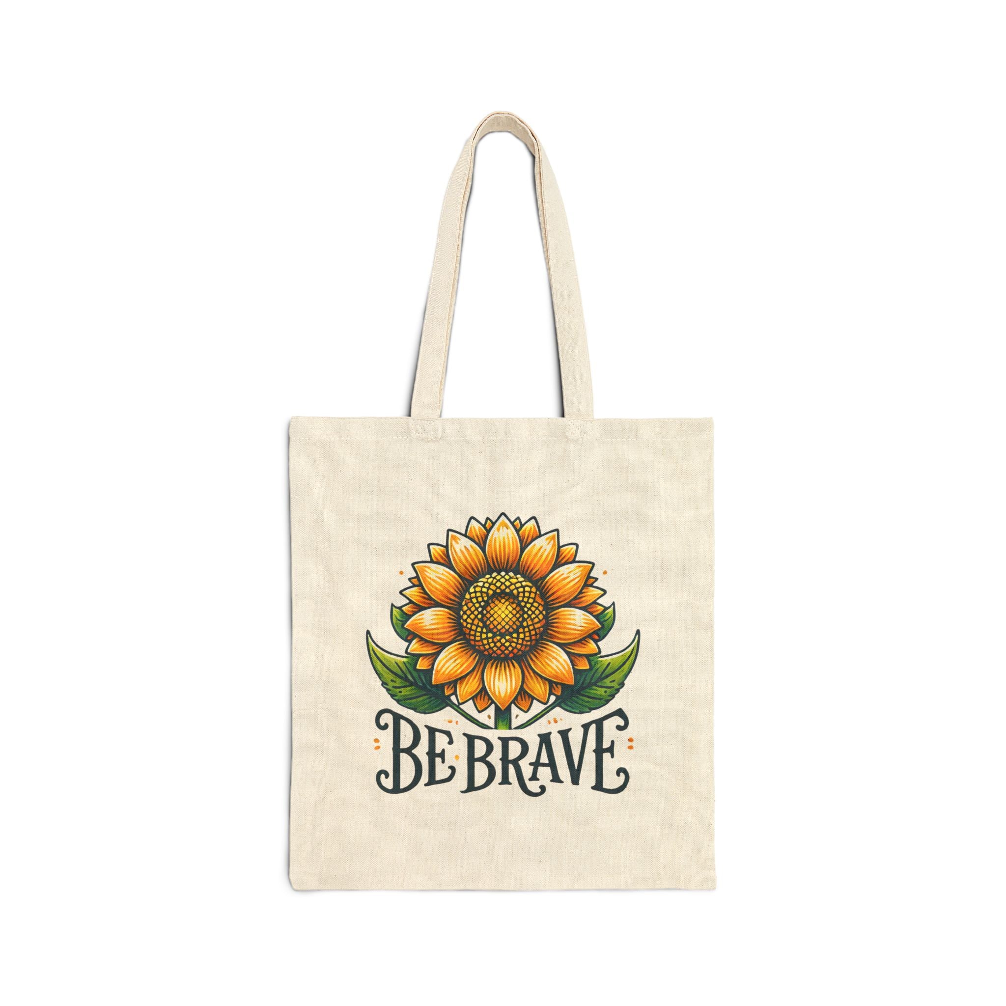 Be Brave Motivational Sunflower Tote Bag | Botanical Bag Positive Message Empowerment Book Bag | Nature Lover Gift | Cotton Canvas Tote Bag