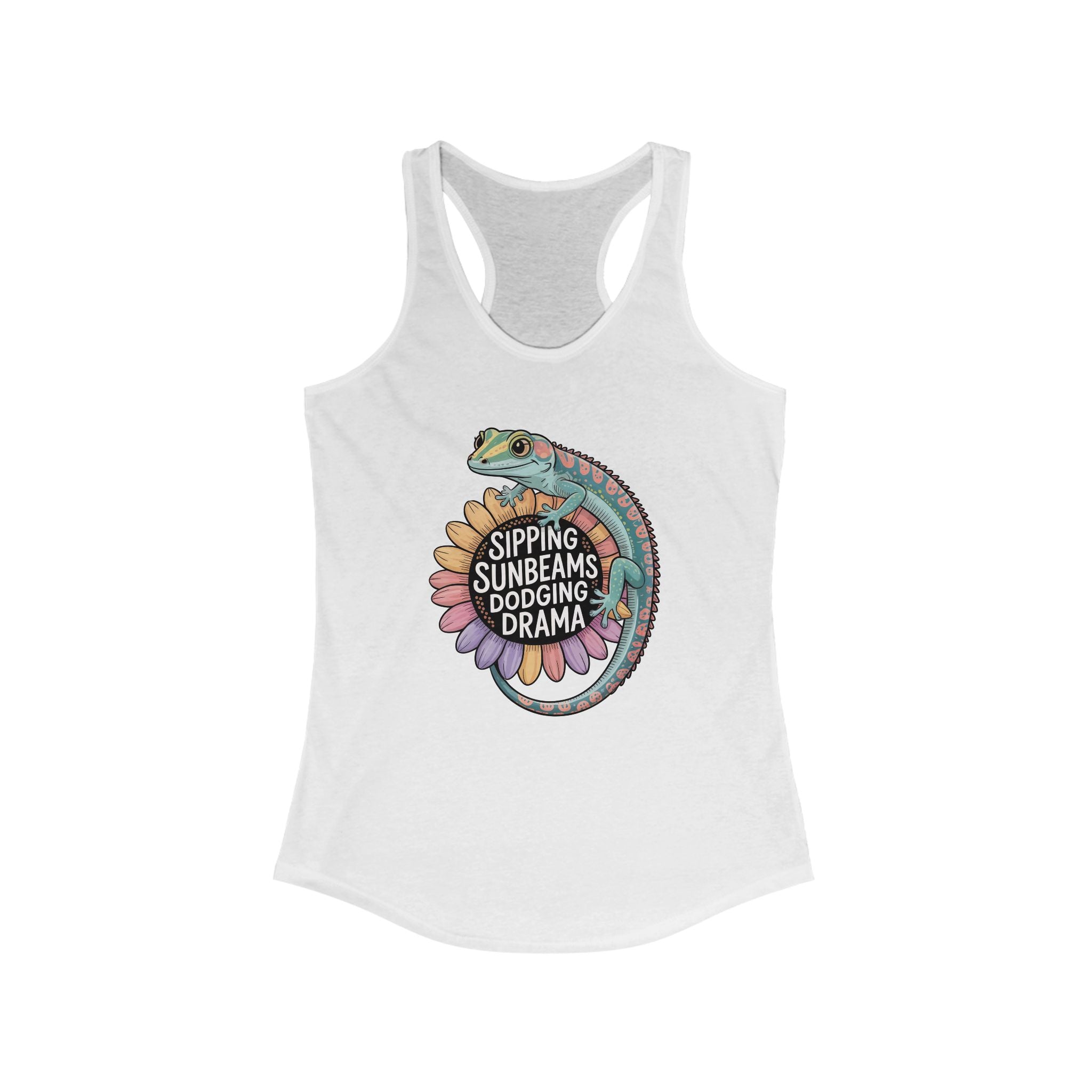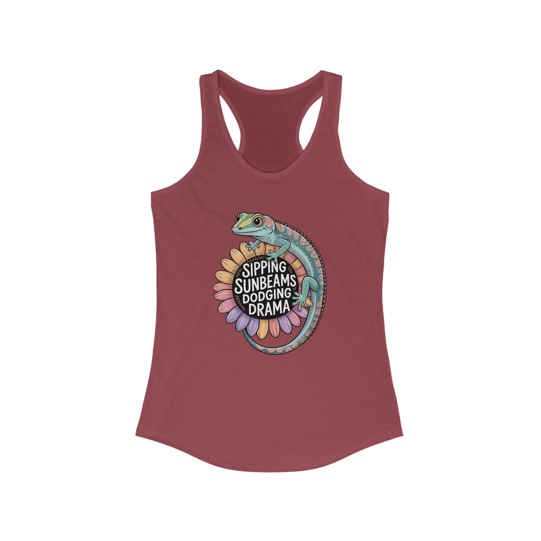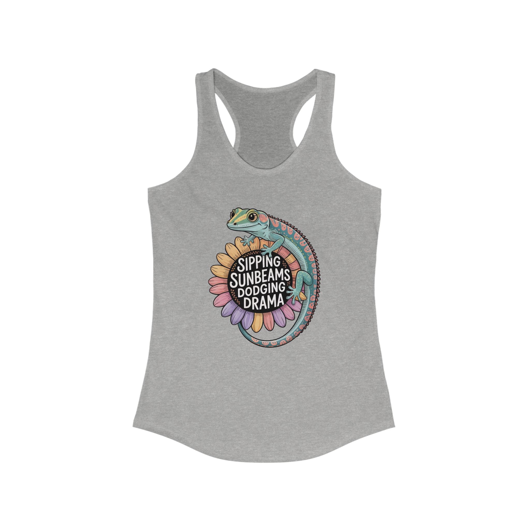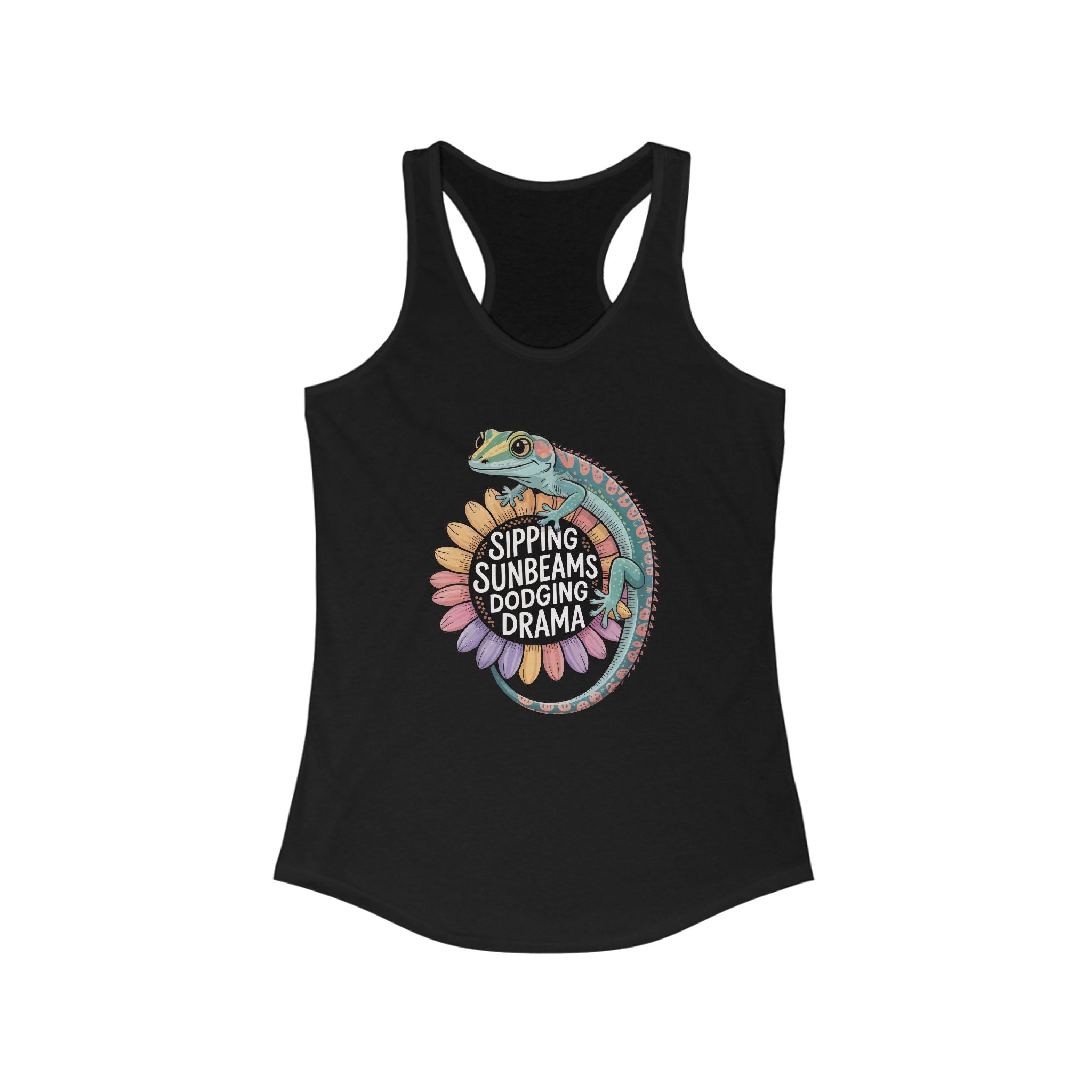 Sipping Sunbeams Cute Gecko Sunflower Shirt | Positive Vibes Summer Shirt | Women's Slim Fit Ideal Racerback Tank