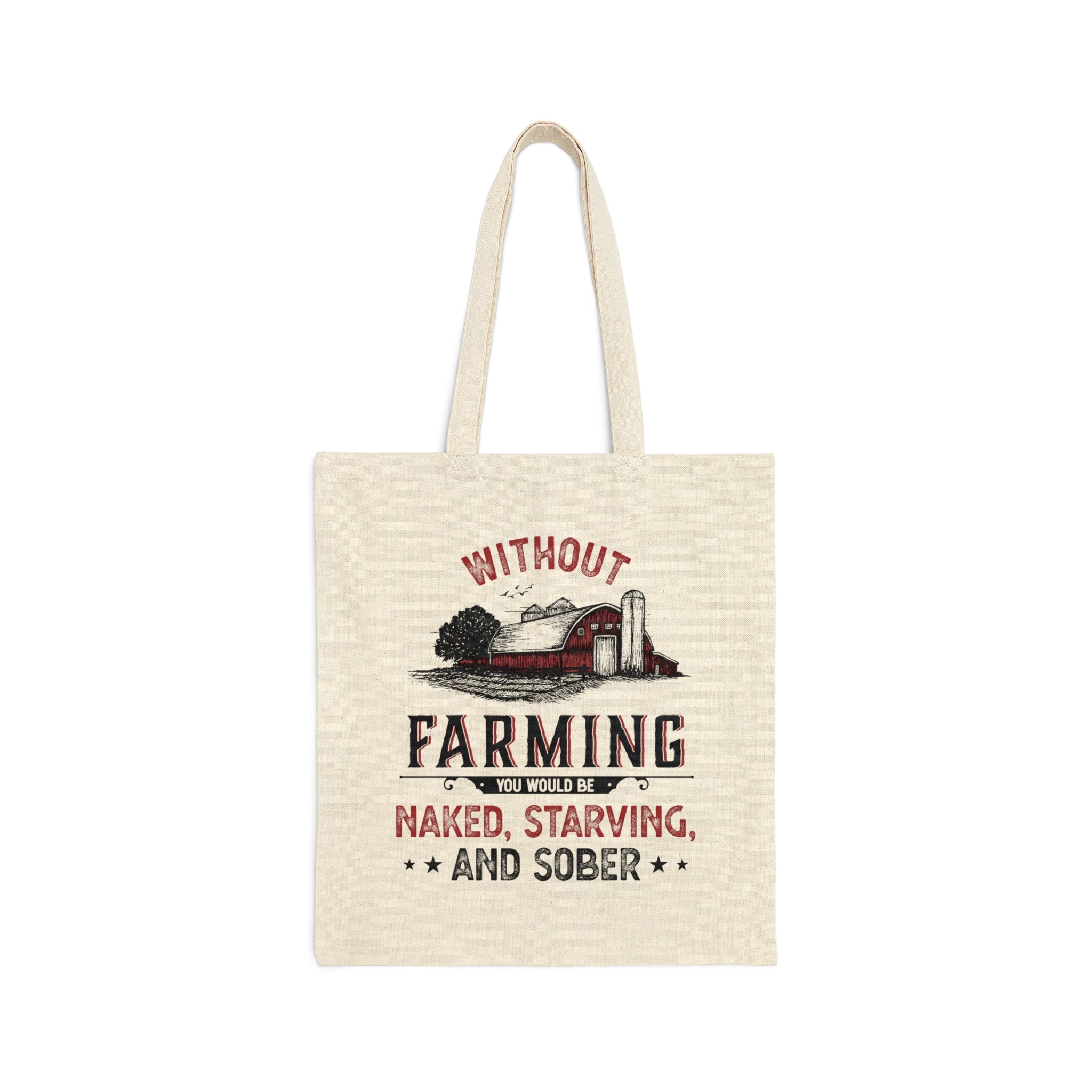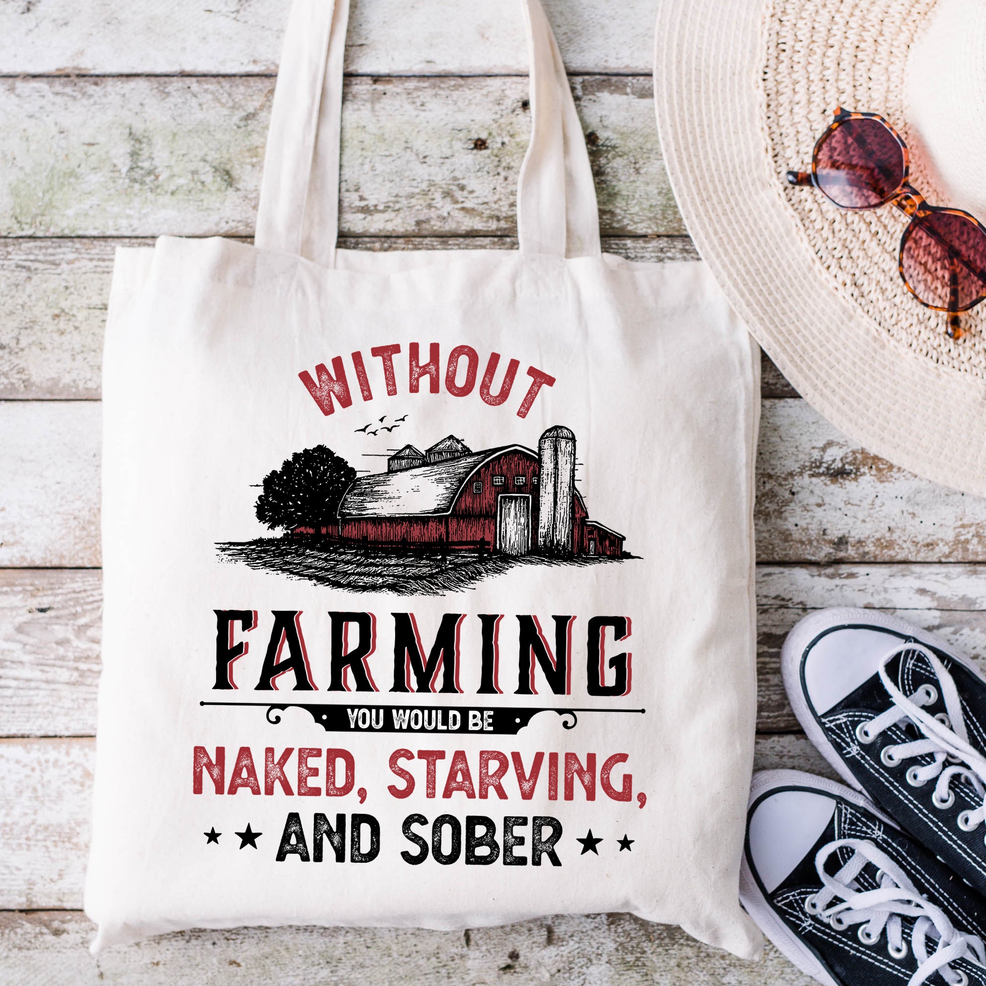Our funny farm tote bag features the text "Without farming you would be naked, starving and sober" and it's a perfect gift for your favorite farmie or anyone who appreciates farm life! This canvas tote bag features the design on both sides of the bag.