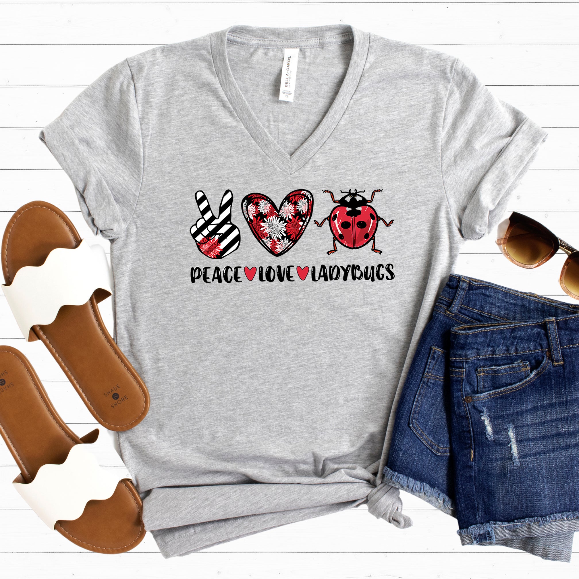 Our cute insect shirts feature the text "Peace Love Ladybugs" and are perfect ladybug gifts for your favorite nature lover! This super comfy v neck t-shirt comes in 2 colors.
