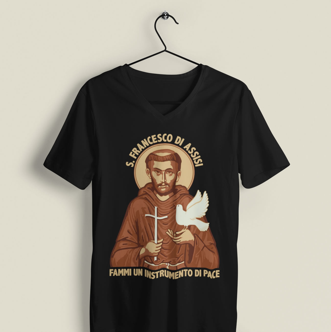 Our St Francis Prayer Catholic t-shirts feature the likeness of St Francis of Assisi (Saint Francis) and the text Fammi Un Instrumento di Pace (Make me an Instrument of Peace) and make the best Italy gifts or best saint gifts for anyone who wants to pay homage to his legacy. St Francis was an Italian saint that advocated for peace, animals, and the environment becoming an example of humility and serving others.