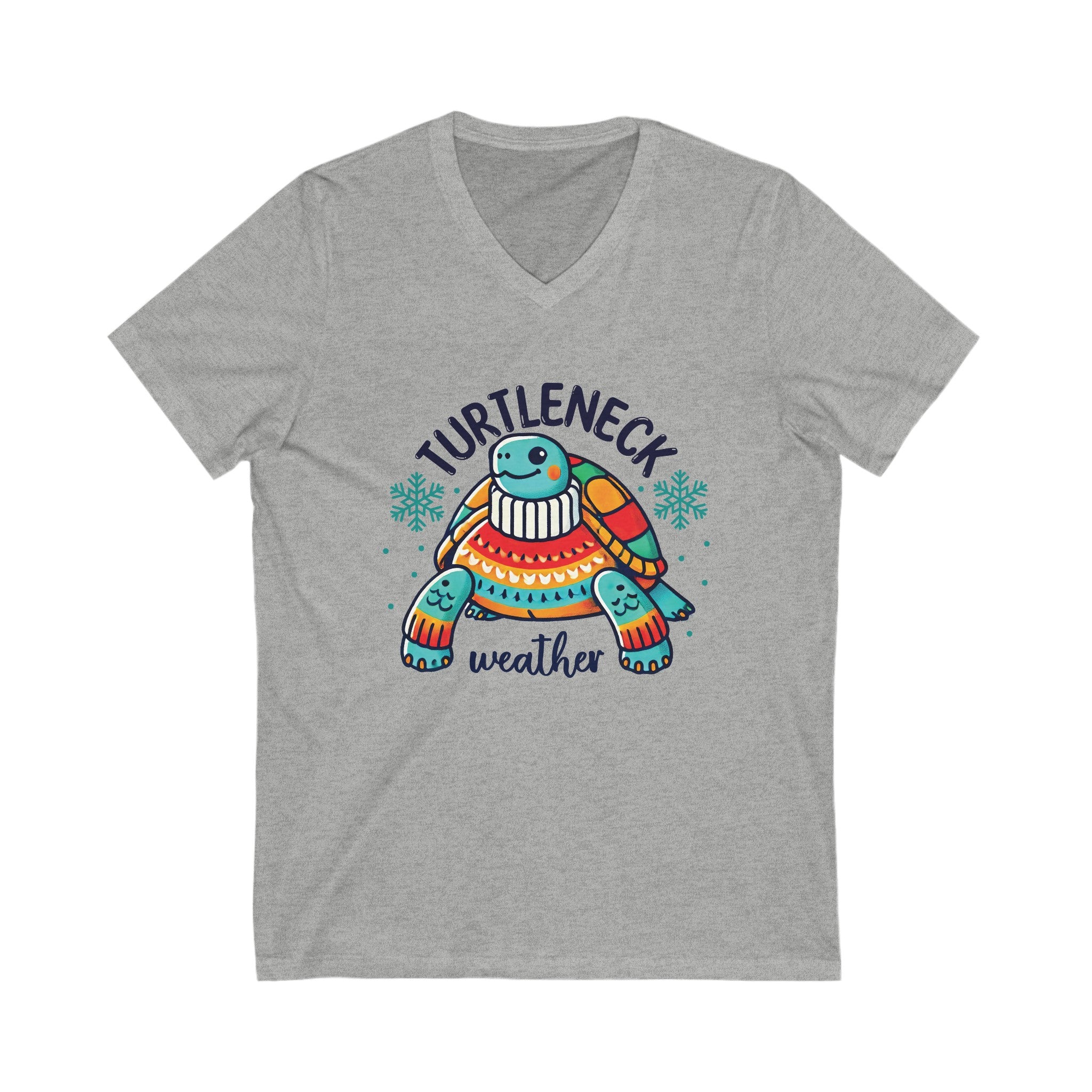 Stay cozy in style with this adorable "Turtleneck Weather" t-shirt! Featuring a cute turtle bundled up in a charming turtleneck sweater, this playful design is perfect for sweater weather fans and animal lovers alike. Whether you're layering up for fall or showing off your love for all things cozy, this tee adds a fun, lighthearted touch to your wardrobe. Great for anyone who enjoys a clever pun and loves turtles, this shirt makes a cute and unique gift for the colder seasons! This comfy unisex v-neck t-shirt comes in 5 beautiful colors.