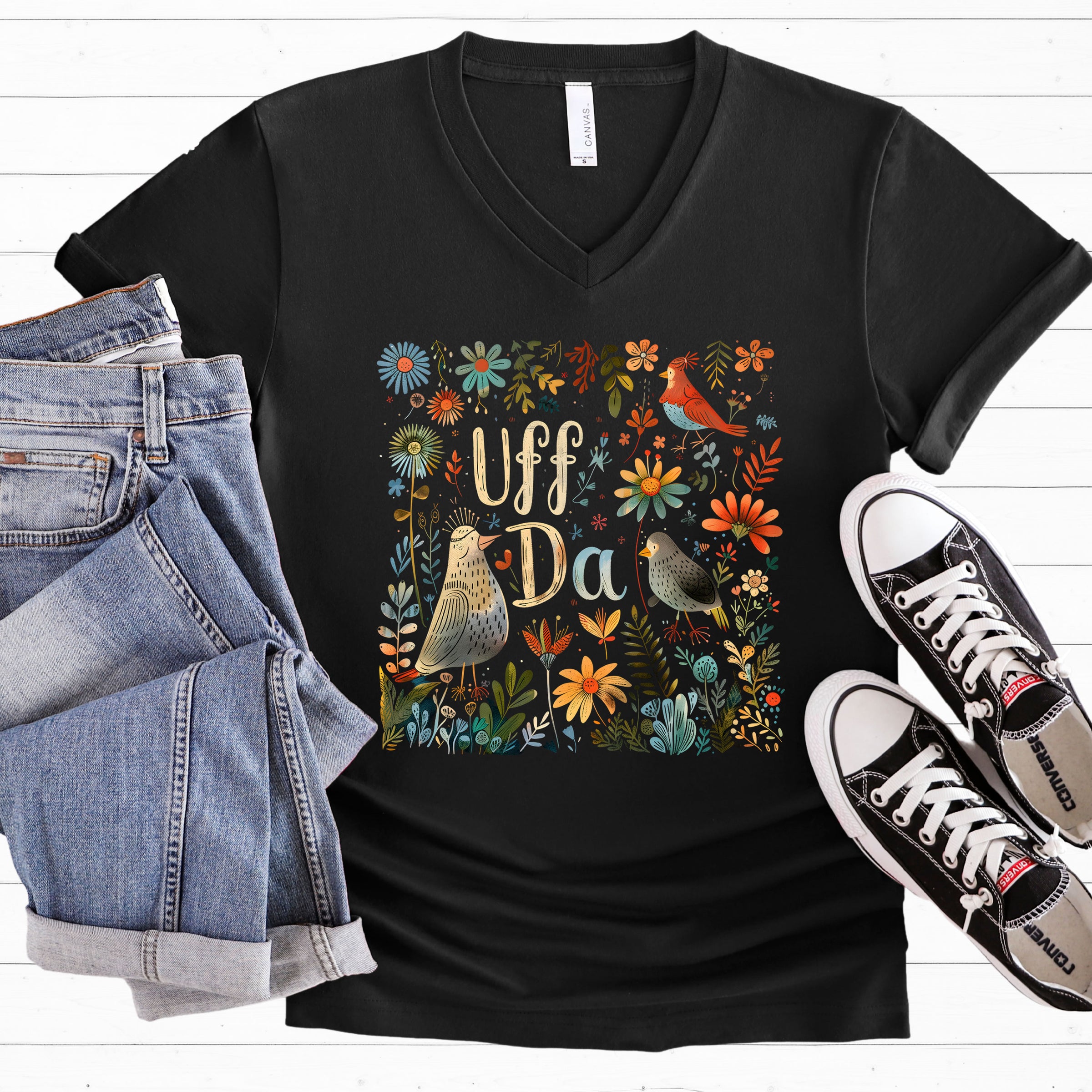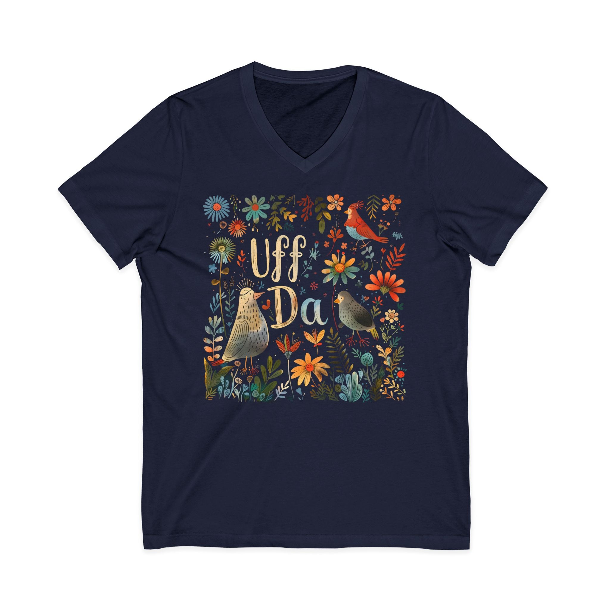 Uff Da Scandi V-neck TShirt | Nordic Folk Art Birds Shirt | Boho Floral Gift | Unisex Jersey V-neck T-shirt