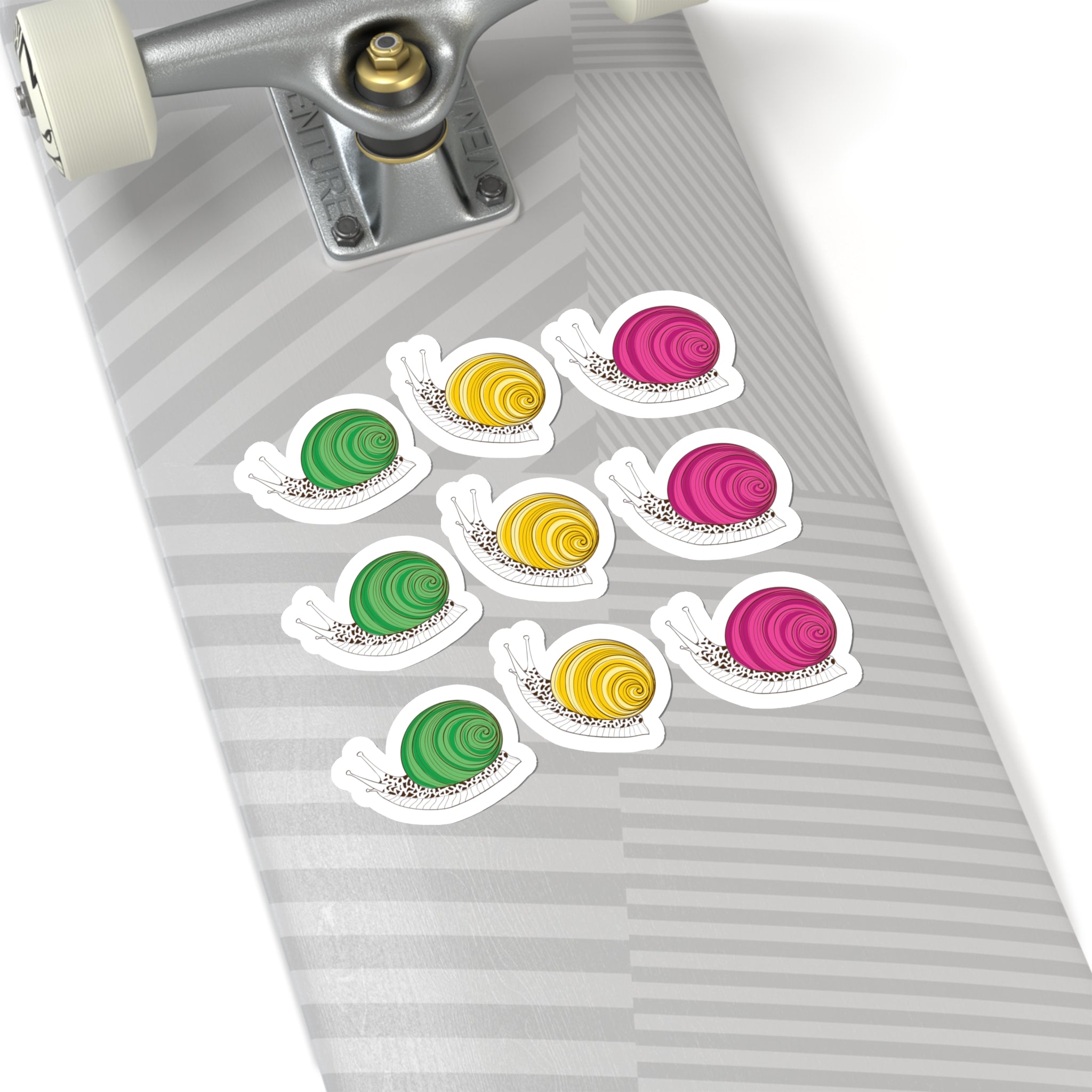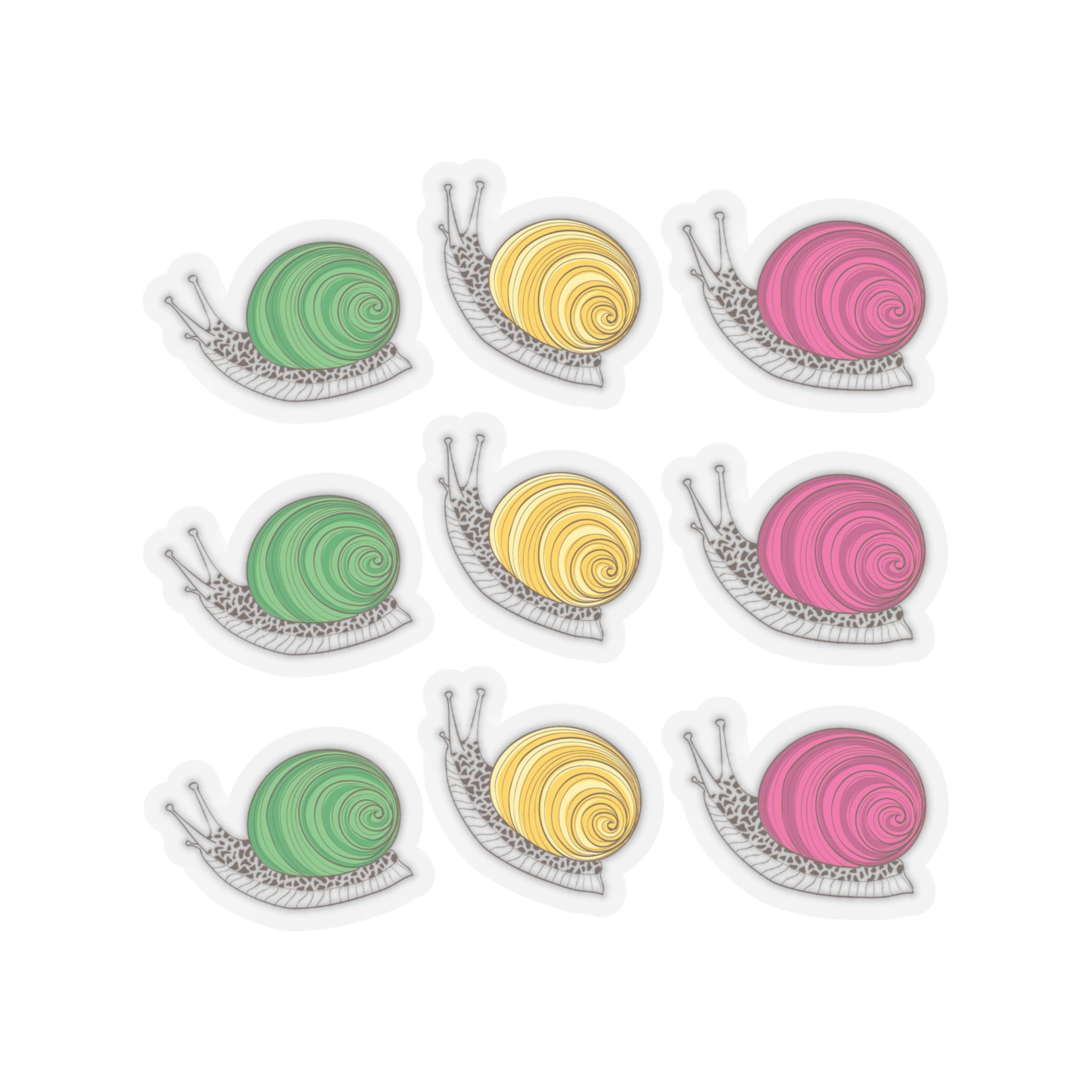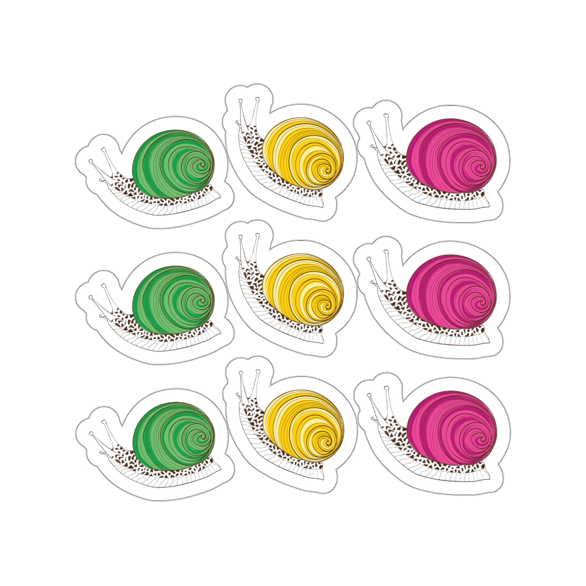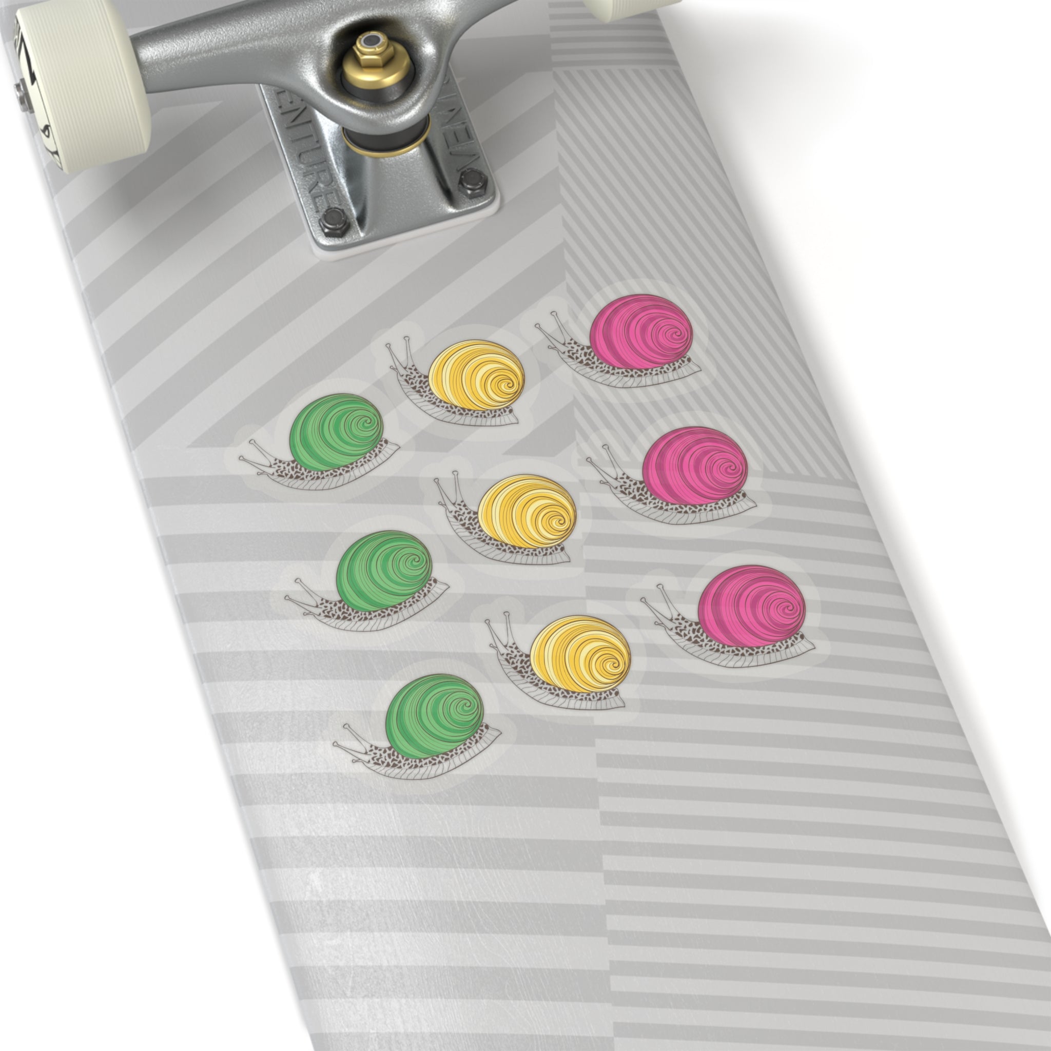 Our nature vinyl stickers features three cute snails and is a perfect nature lover gift for anyone who loves snails! Includes one 6" x 6" or 4" x 4" sheet with 3 peel-off stickers (3 sets of 3 snails) on transparent or white backgrounds.
