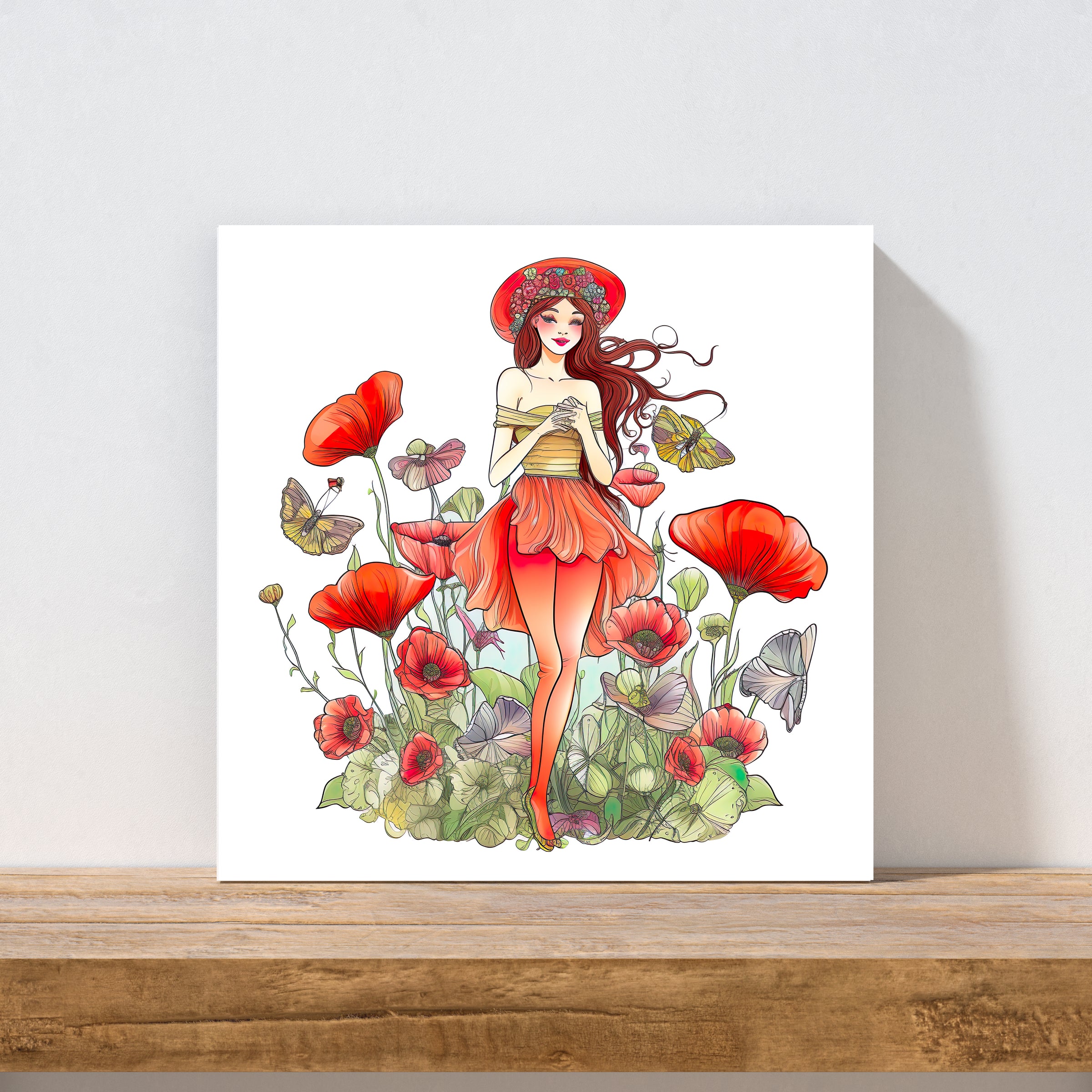 Our Poppy Art Print features a beautiful girl in a field of fantastical vibrant red poppies and will enhance your home decor with a touch of boho charm. This floral wall art is created on a matte finish stretched canvas with a 1.25 inch depth and it comes in 5 sizes.